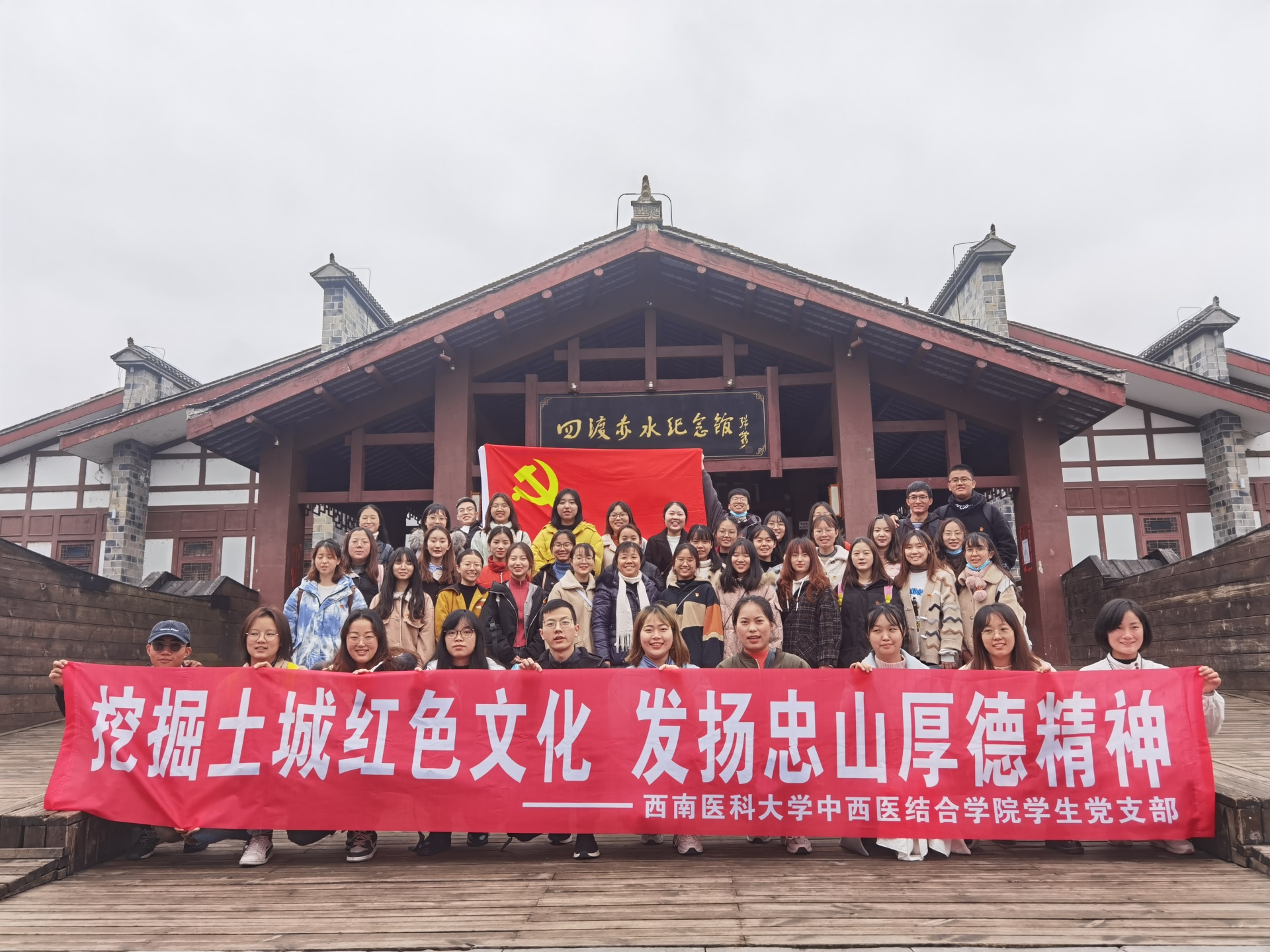 2020年11月29日,中西医结合学院学生党支部一行48人在贵州省习水县土城古镇开展了“挖掘土城红色文化,发扬忠山厚德精神”主题党日活动。学生党支部书记马俊和全体在校党员参加了活动。