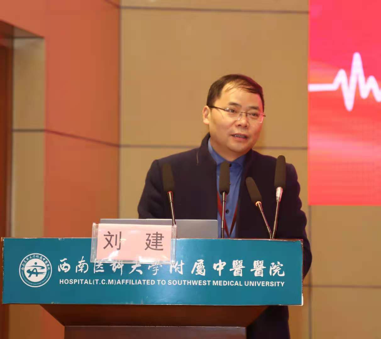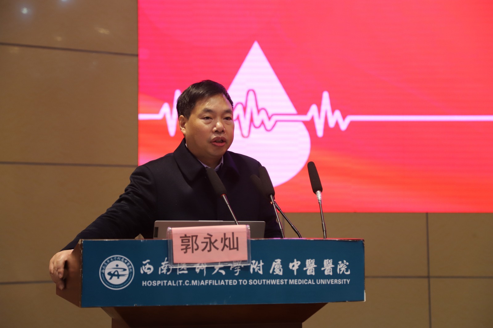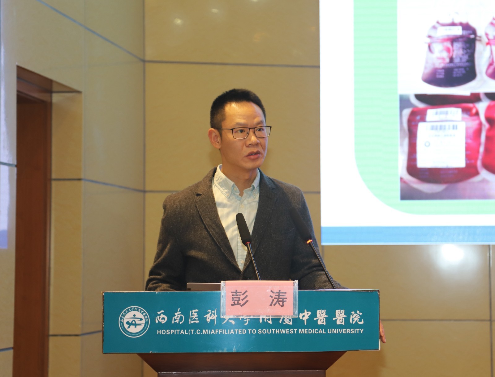 刘建致辞,他介绍了我院基本情况及输血科、检验科相关情况后,希望与会人员以本次会议为契机,加强学习,增进交流,促进输血、检验学科发展,更好地为泸州及周边地区人民群众健康保驾护航。