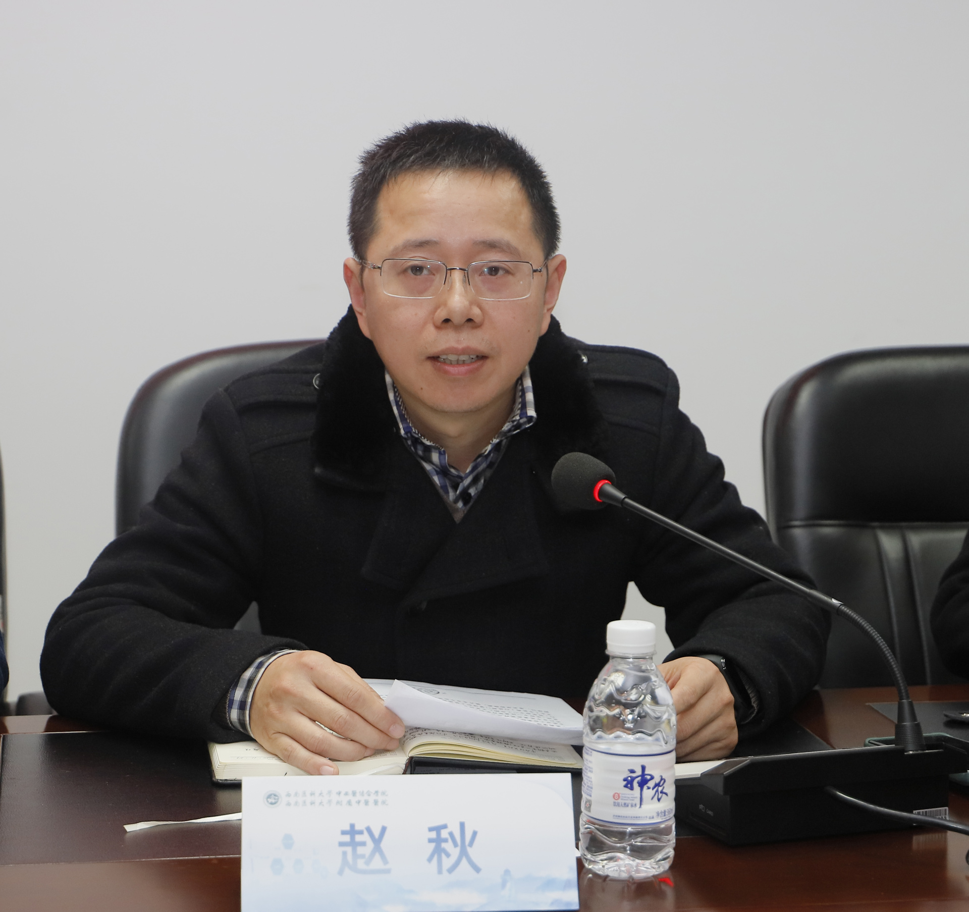 赵秋讲话,他宣读了《泸州市中医药管理局关于成立泸州市中医重症医疗质量控制中心的通知》,并表示祝贺。