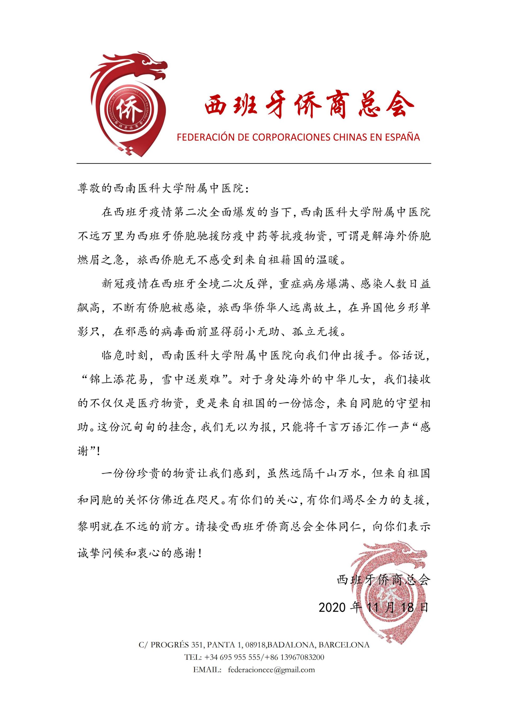 2020年11月18日,我院收到了来自西班牙侨商总会的一封感谢信,信中对我院在抗击新冠肺炎疫情中勇于承担社会责任,充分发挥自身优势,向西班牙侨商总会捐赠所需的抗疫医用物资表达了谢意。