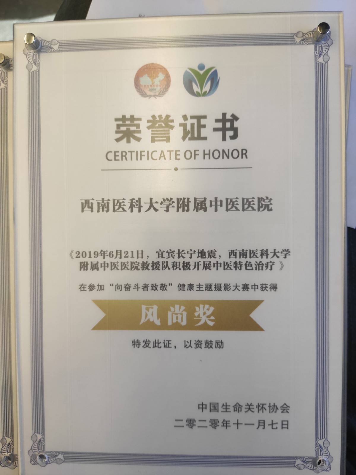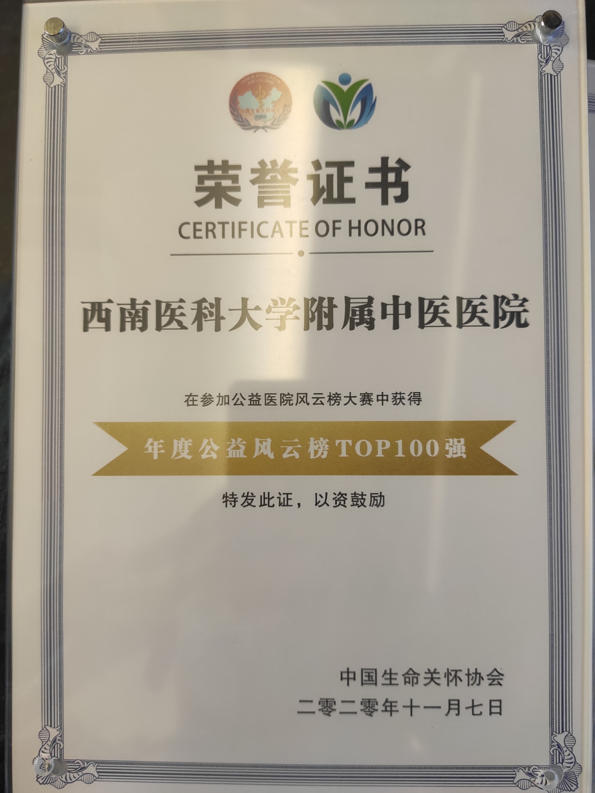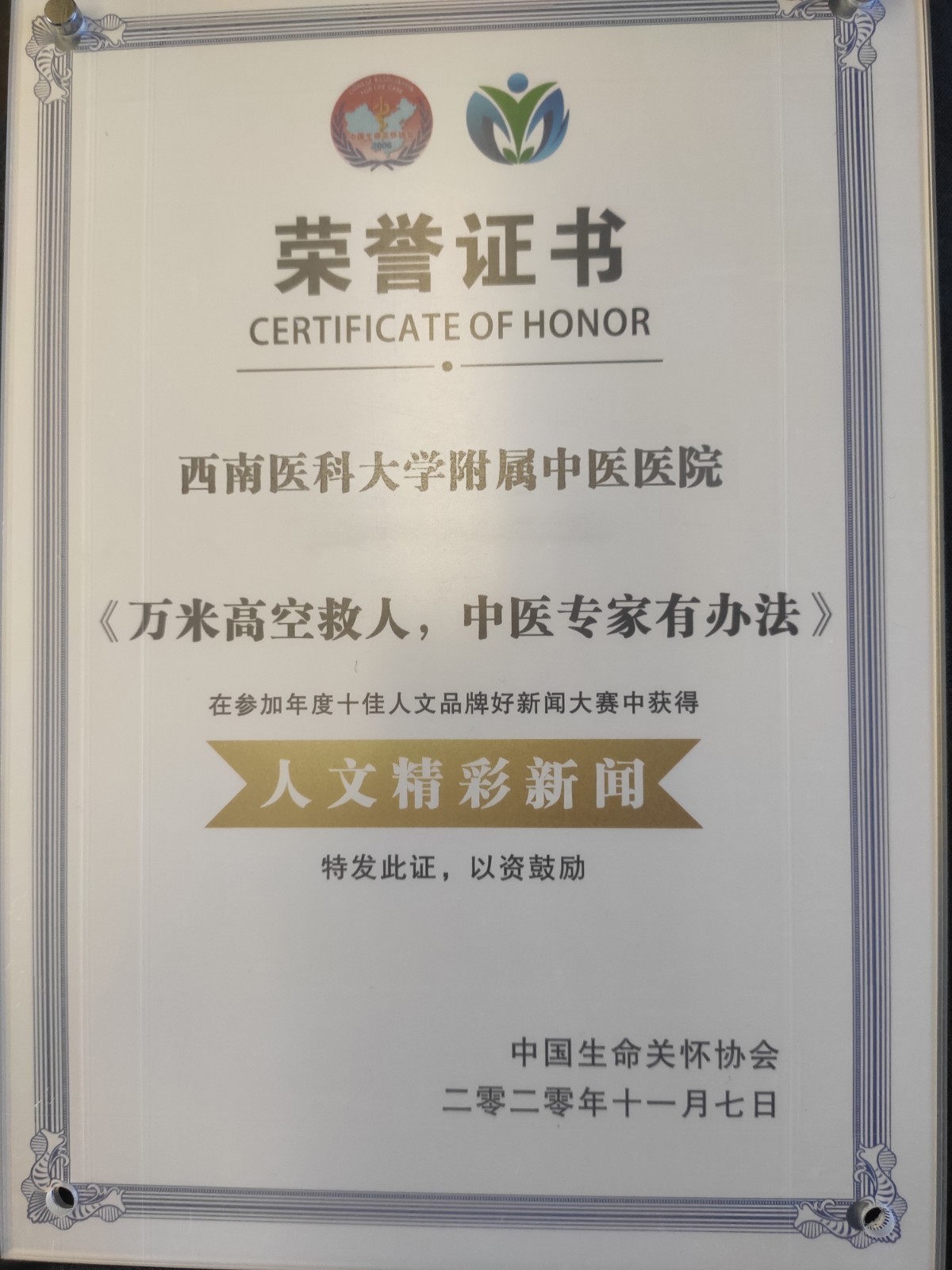 会上,我院荣获2020年年度公益医院风云榜TOP100强荣誉称号,新生儿科荣获年度人文创新团队荣誉称号,肝胆病科孙同郊教授荣获2020年度人文杰出人物荣誉称号,新闻作品《万米高空救人,中医专家有办法》荣获年度十佳人文品牌好新闻大赛人文精彩新闻奖,影像作品《英雄机长为队员们加油鼓劲》《2019年6月21日,宜宾长宁地震,西南医科大学附属中医医院救援队积极开展中医特色治疗》荣获“向奋斗者致敬”健康主题微视频大赛风尚奖。