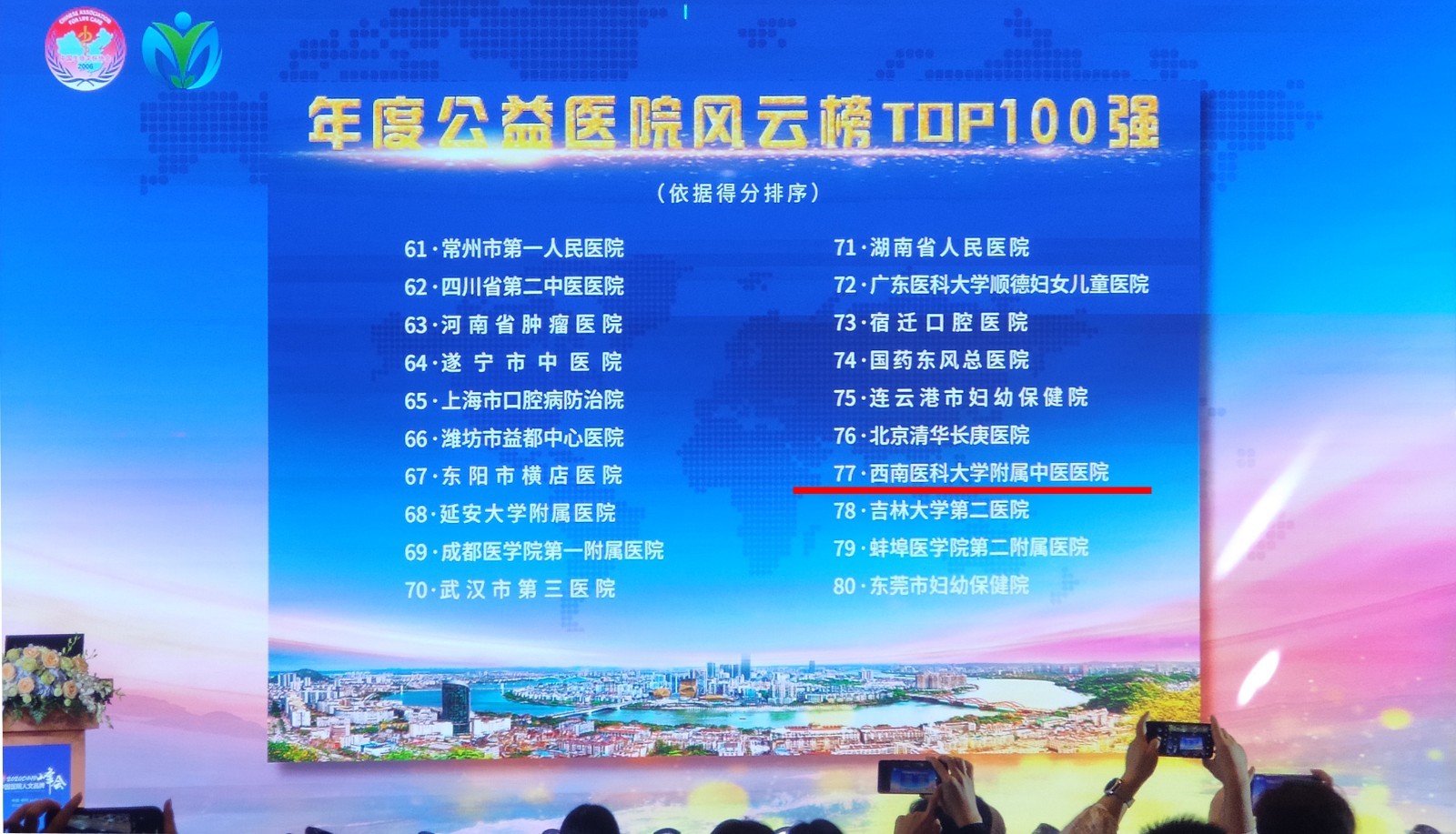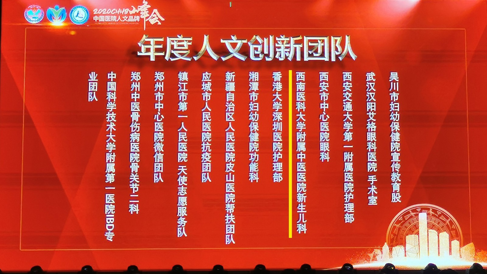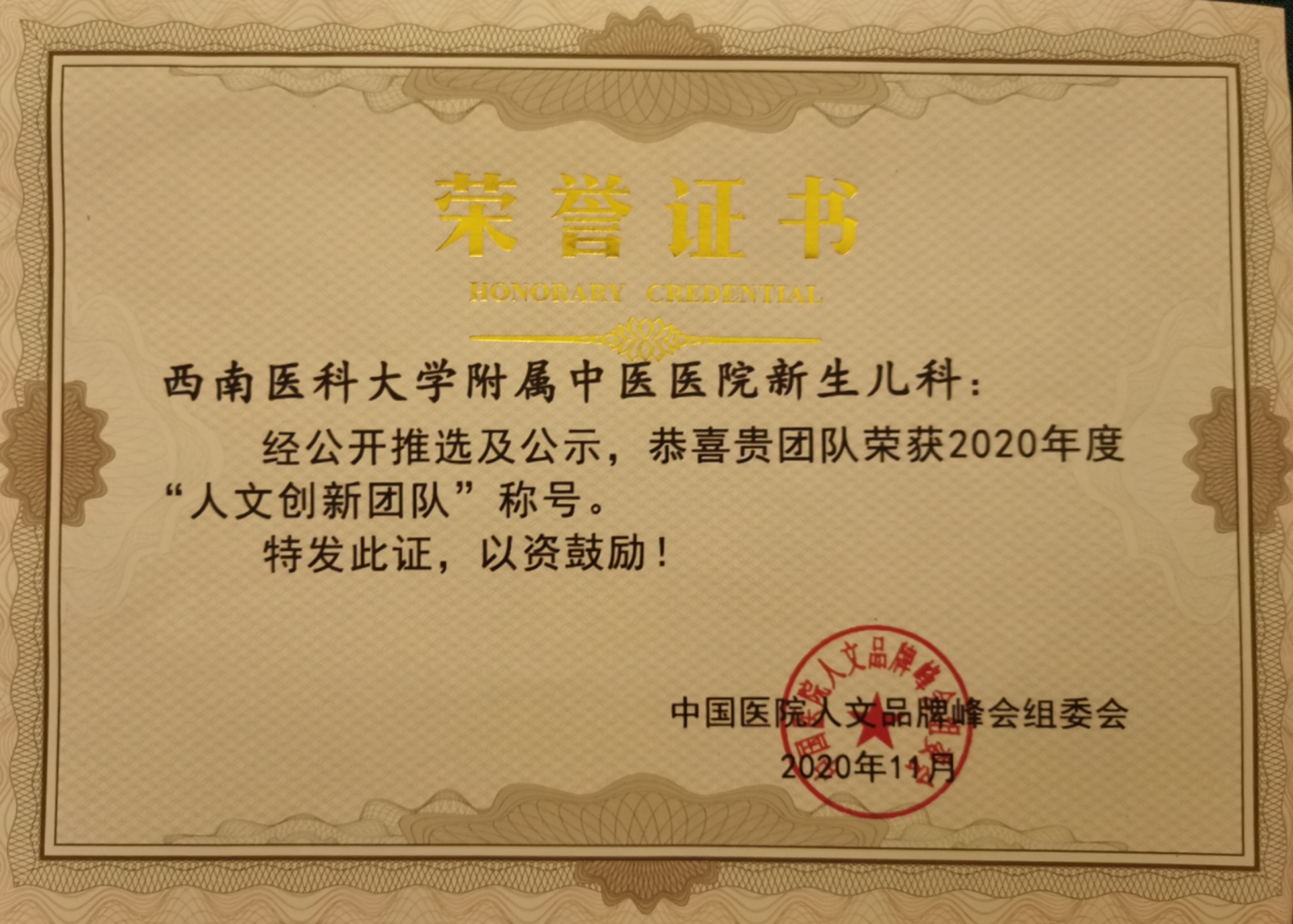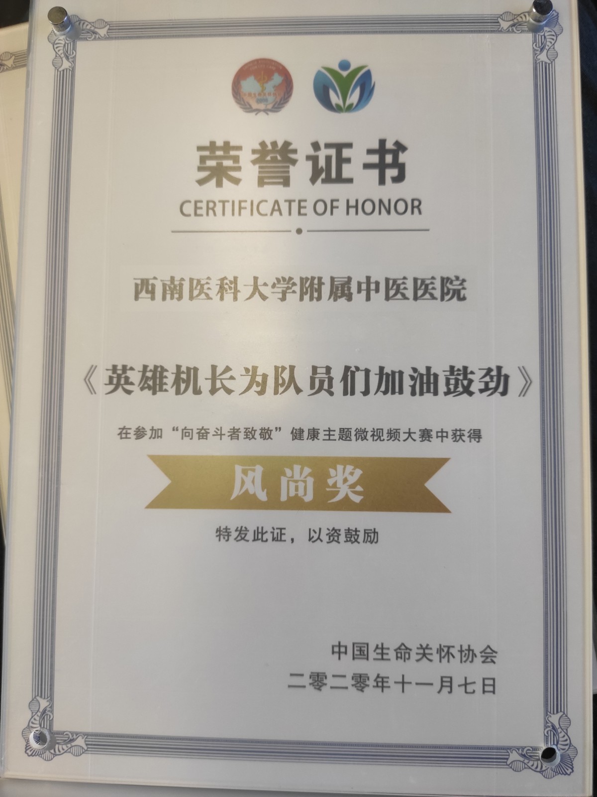 会上,我院荣获2020年年度公益医院风云榜TOP100强荣誉称号,新生儿科荣获年度人文创新团队荣誉称号,肝胆病科孙同郊教授荣获2020年度人文杰出人物荣誉称号,新闻作品《万米高空救人,中医专家有办法》荣获年度十佳人文品牌好新闻大赛人文精彩新闻奖,影像作品《英雄机长为队员们加油鼓劲》《2019年6月21日,宜宾长宁地震,西南医科大学附属中医医院救援队积极开展中医特色治疗》荣获“向奋斗者致敬”健康主题微视频大赛风尚奖。