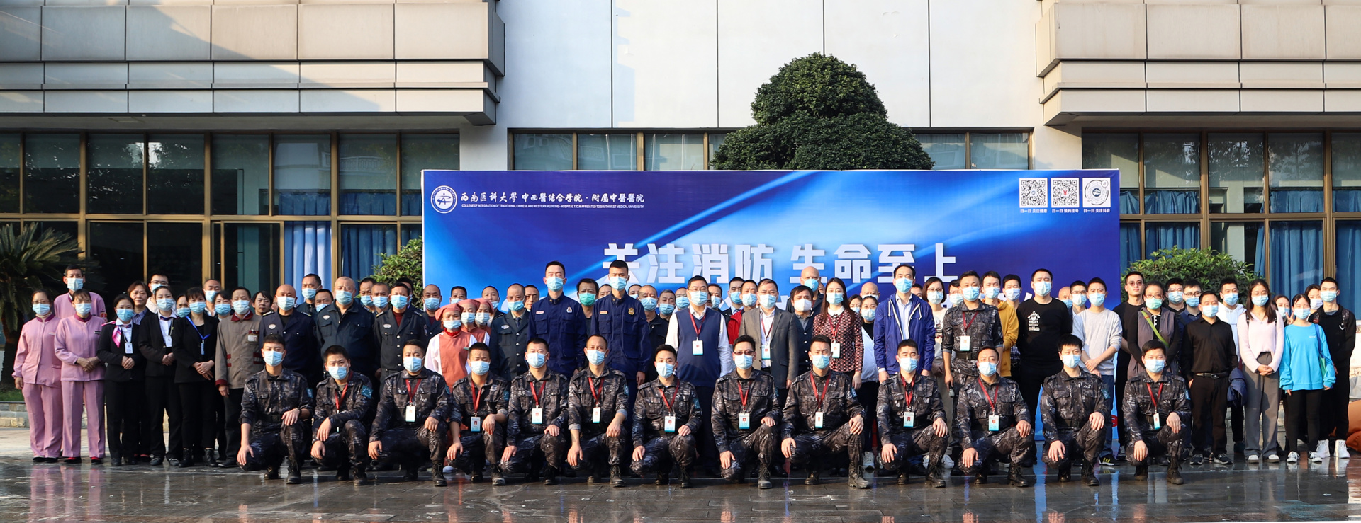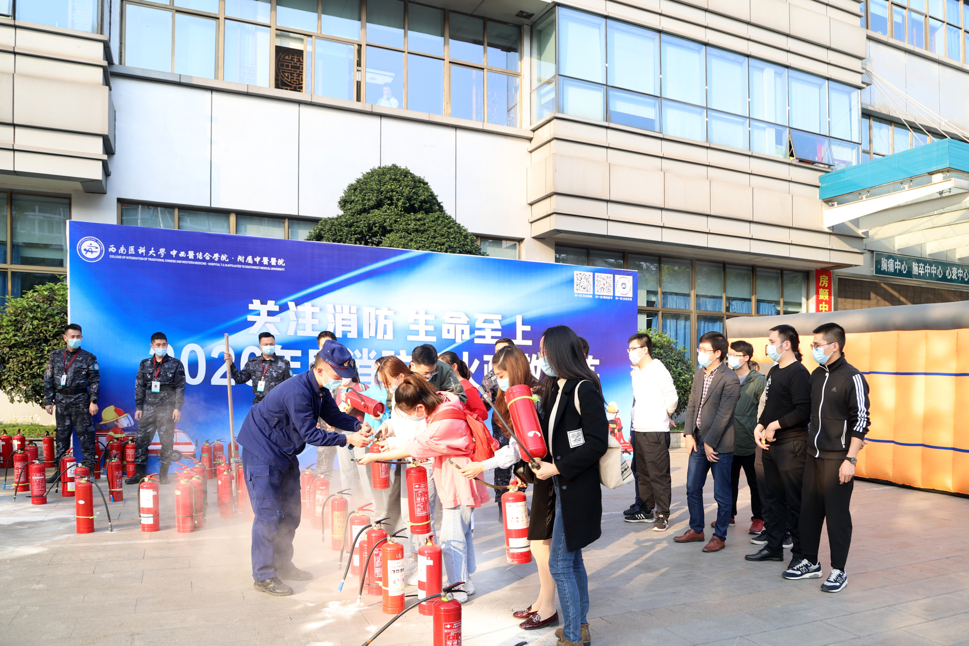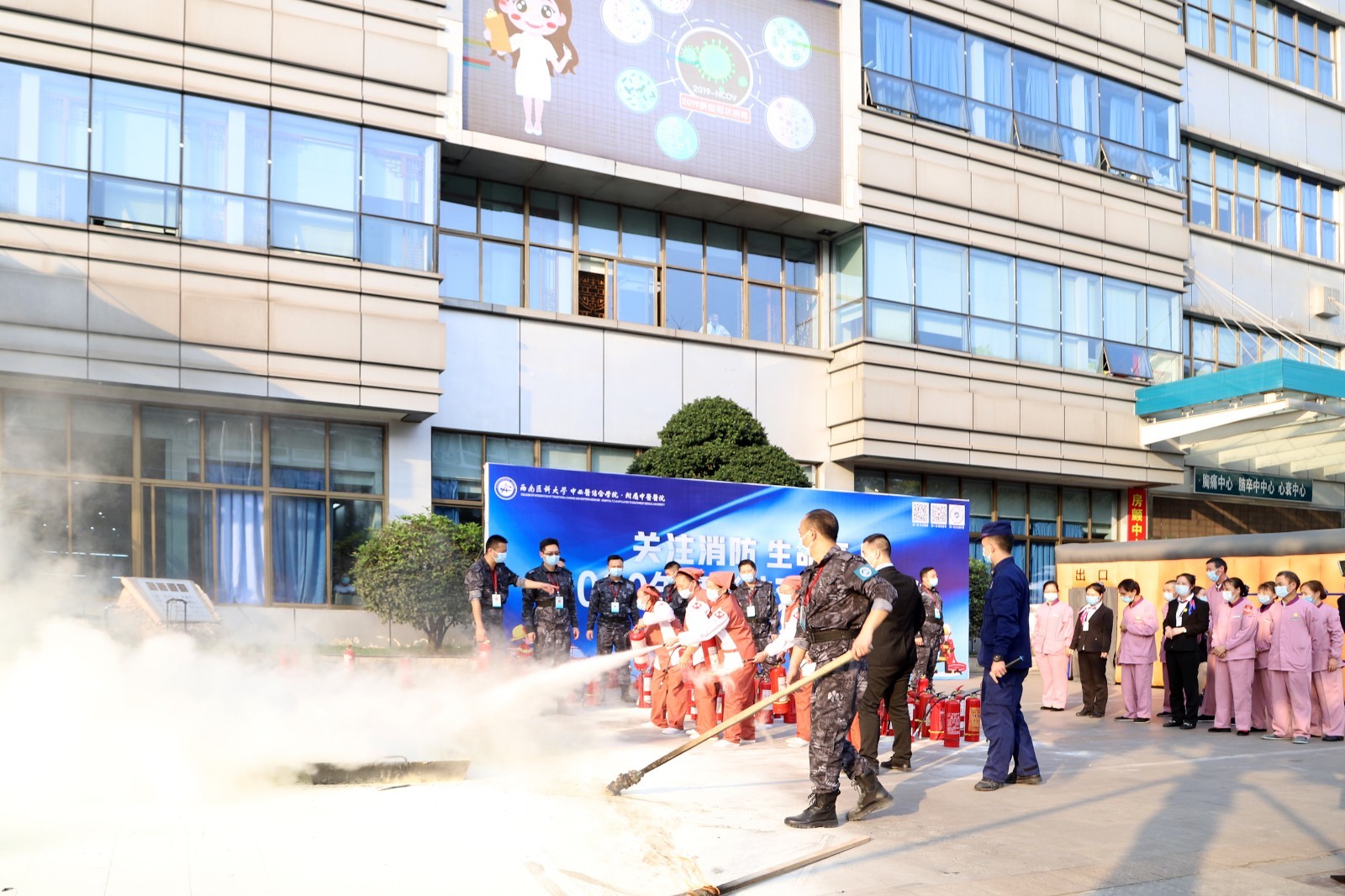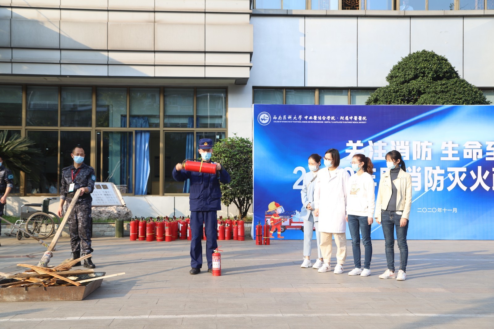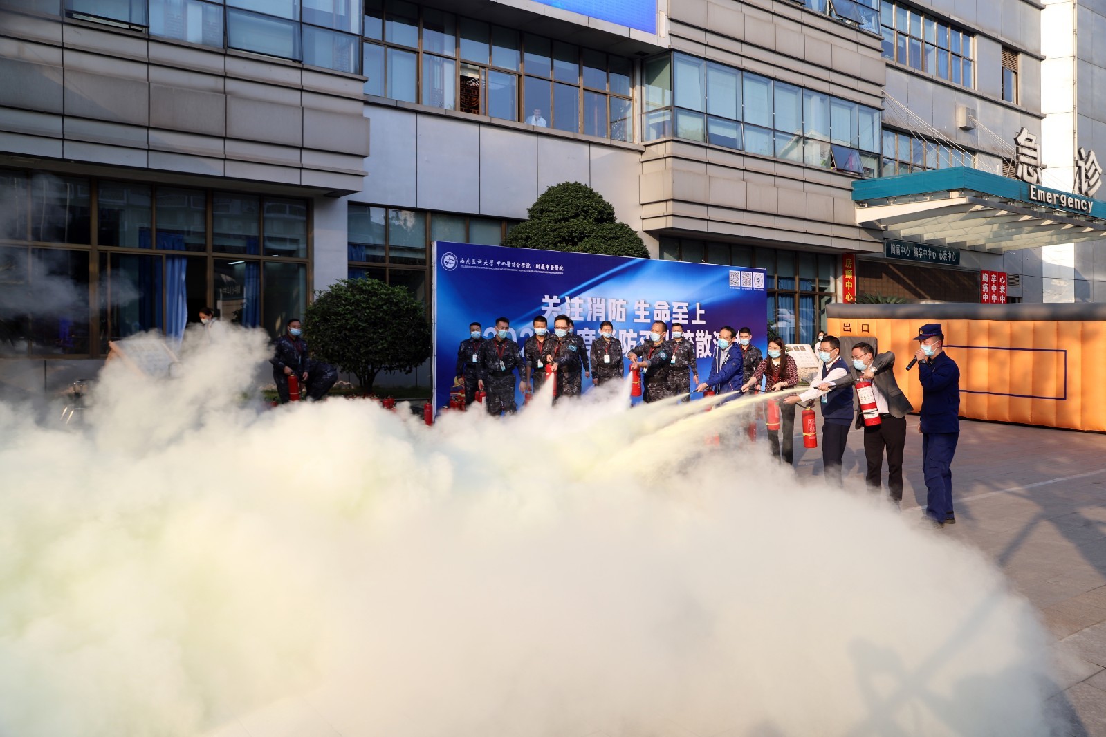 讲座结束后,医院组织与会人员在门前广场开展了灭火演练活动。泸州市龙马潭区摇翔路中队战斗班班长演示了灭火器的使用和发生火灾时逃生自救的方法,现场人员进行了消防疏散逃生和现场灭火模拟演练。