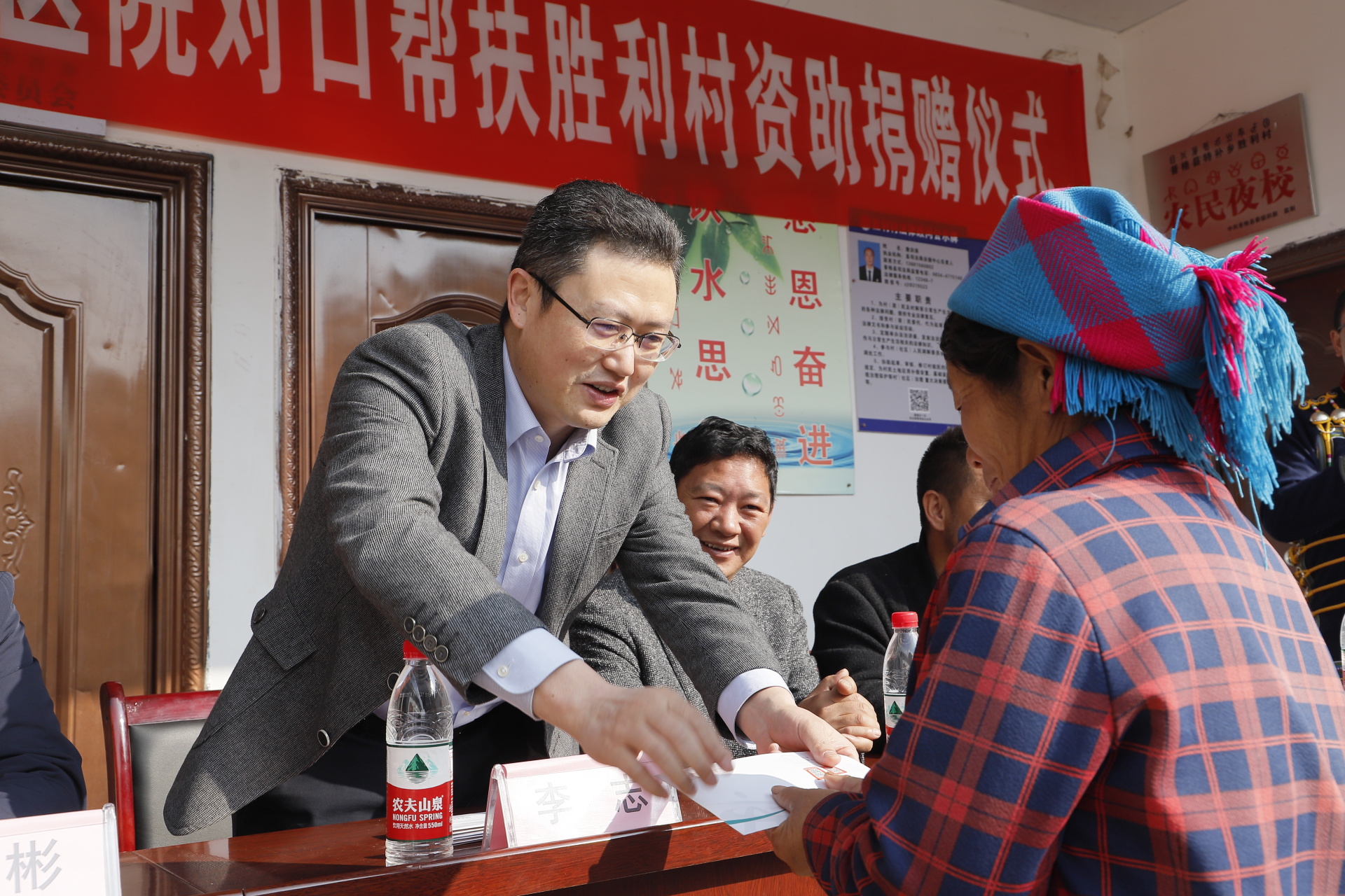 资助捐赠仪式上,李志代表医院向胜利村捐赠63426元,用于幼儿园校服购买和集中餐饮点建设,并向9位今年考上大学的大学生贫困户代表发放了1000元助学金。