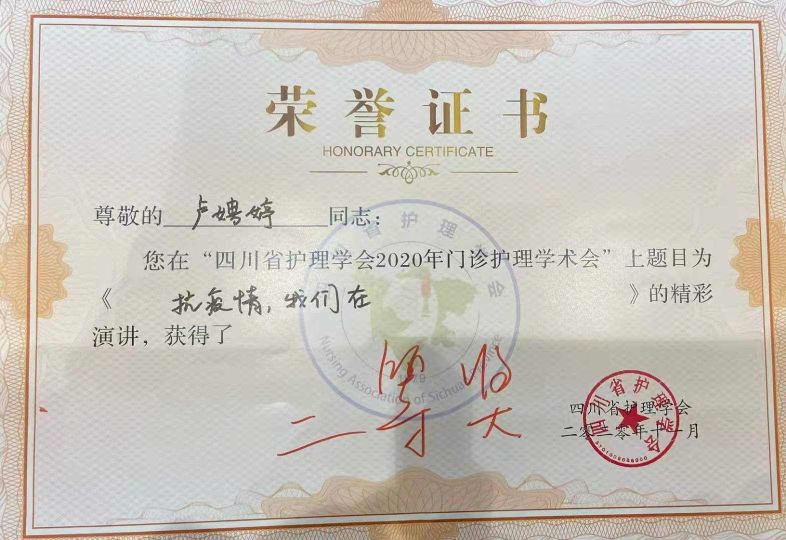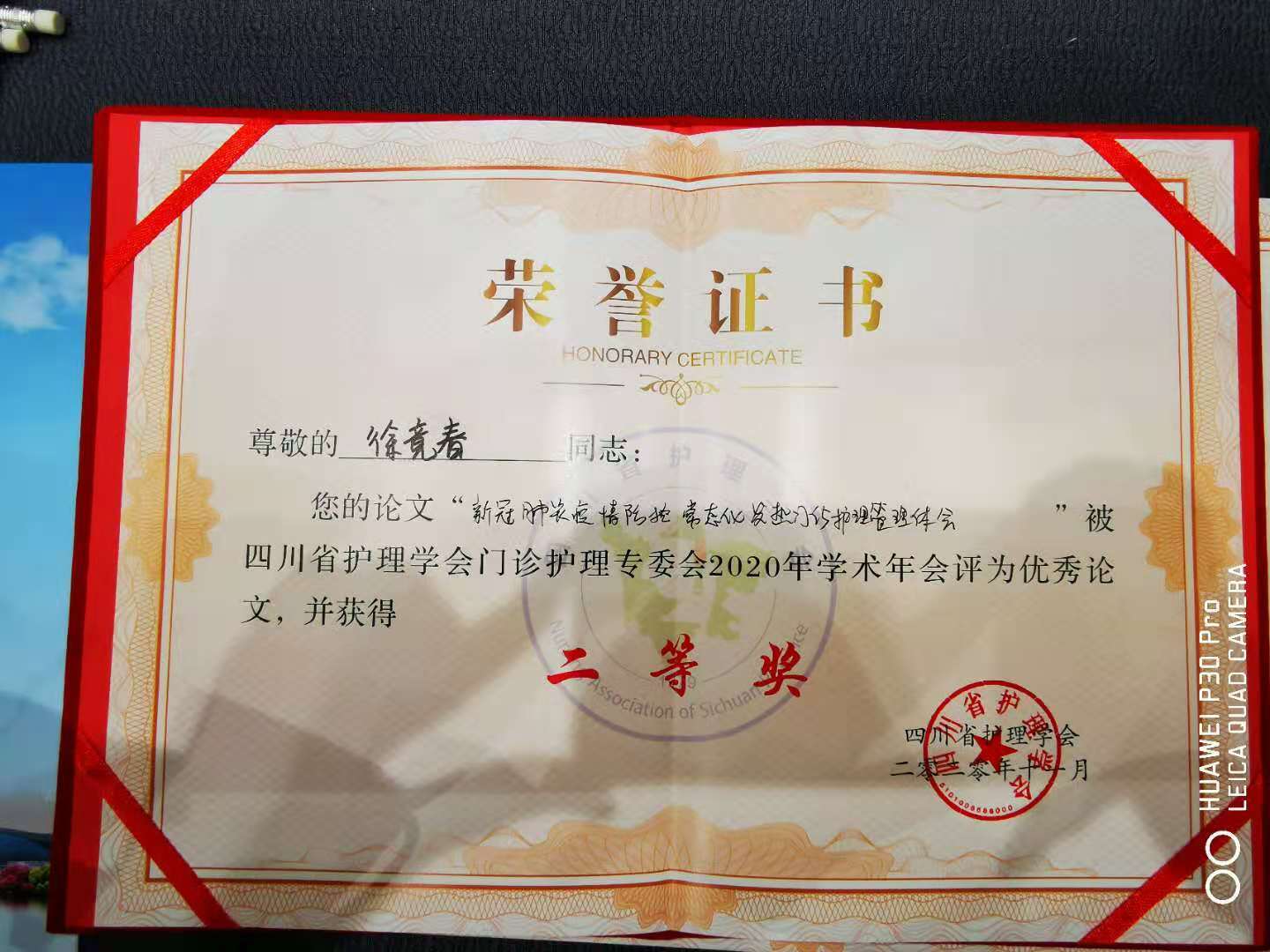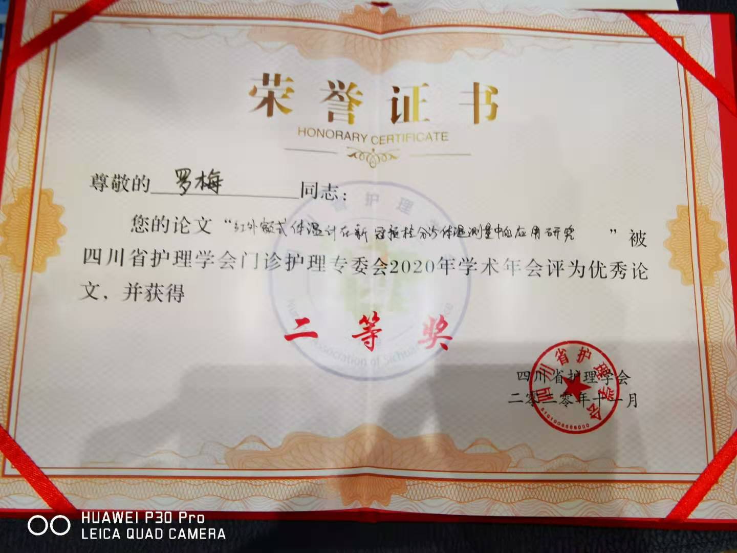 2020年11月11日-13日,四川省护理学会2020年门诊护理学术会在成都召开。在大会演讲比赛中,城北门诊部刘春梅护师、卢娉婷护师作了《抗疫情,我们在》演讲,荣获二等奖;城北门诊部赵开莉副主任护师论文《探讨岗位设置联合绩效管理在门诊护理管理中的应用效果》荣获优秀论文一等奖,徐竟春护师论文《新冠肺炎疫情防控常态化发热门诊护理管理体会》荣获优秀论文二等奖,罗梅护师论文《红外额式体温计在新冠预检分诊体温测量中的应用研究》荣获优秀论文二等奖,杨春护士论文《加强门诊护理管理的方法及相关研究》荣获优秀论文二等奖,彭孟丽护士论文《新型冠状病毒感染时期发热门诊护理管理体会》荣获优秀奖。