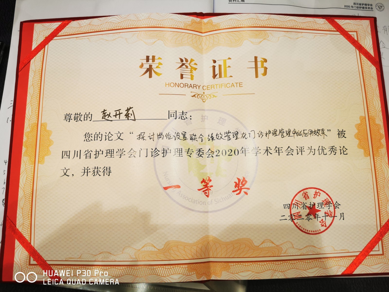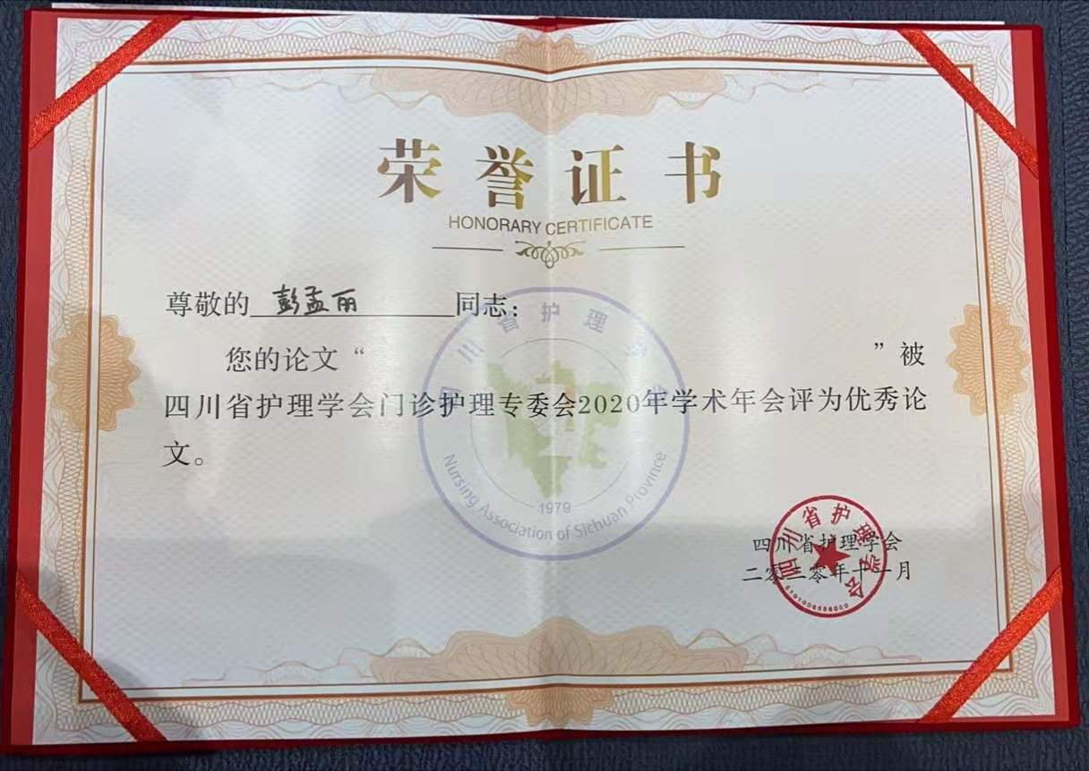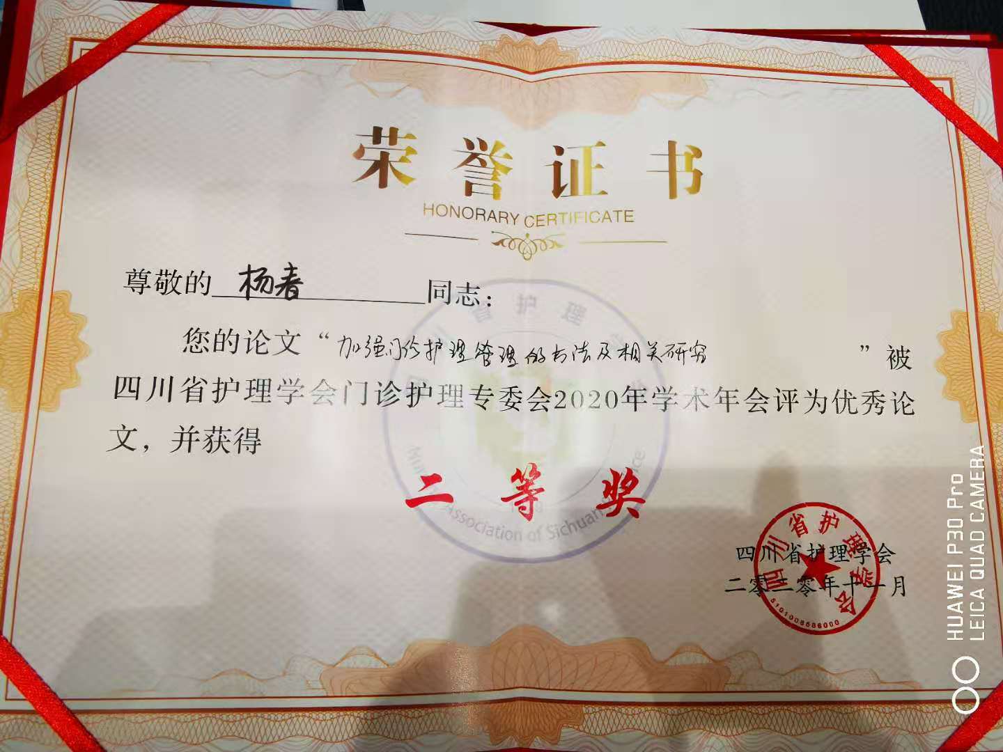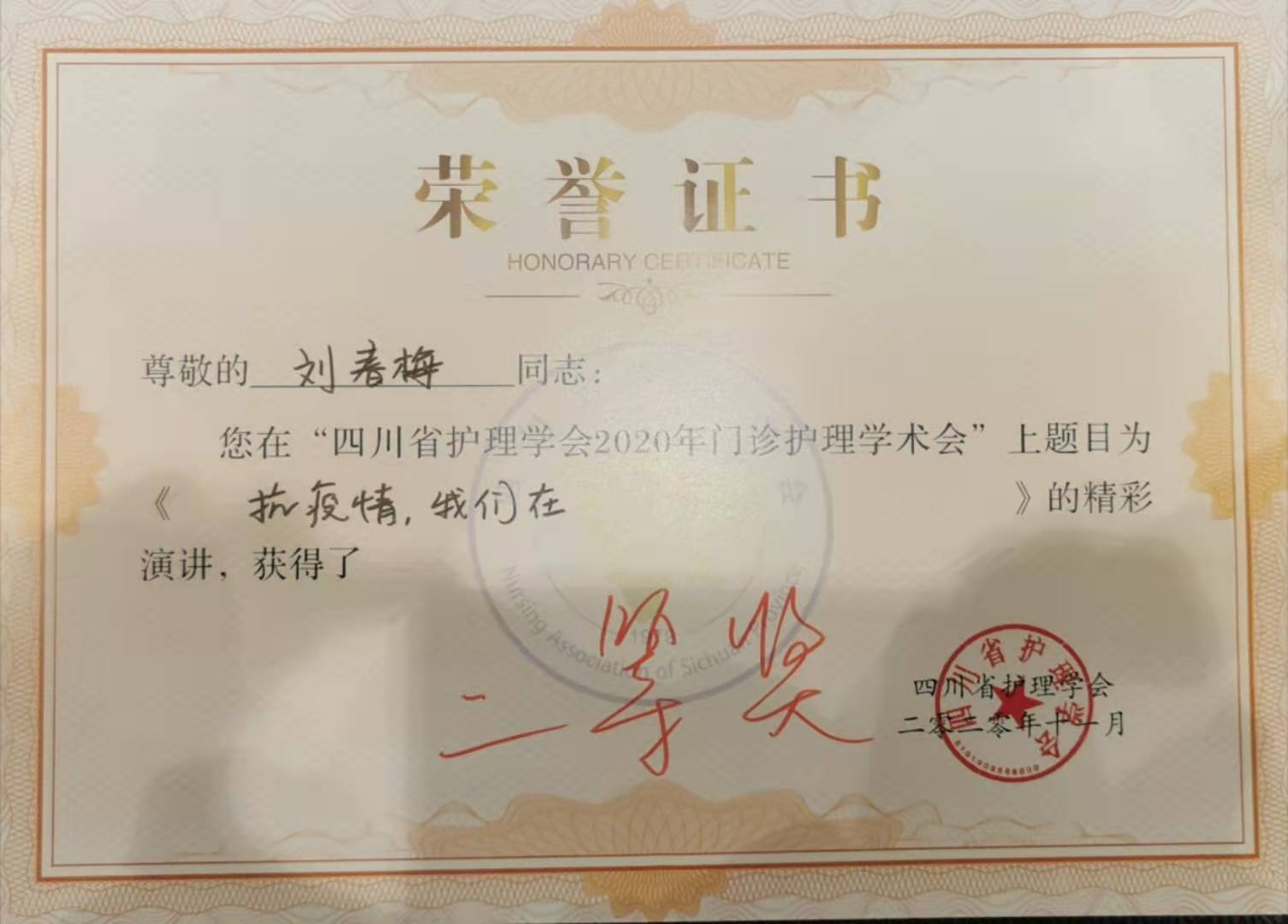 2020年11月11日-13日,四川省护理学会2020年门诊护理学术会在成都召开。在大会演讲比赛中,城北门诊部刘春梅护师、卢娉婷护师作了《抗疫情,我们在》演讲,荣获二等奖;城北门诊部赵开莉副主任护师论文《探讨岗位设置联合绩效管理在门诊护理管理中的应用效果》荣获优秀论文一等奖,徐竟春护师论文《新冠肺炎疫情防控常态化发热门诊护理管理体会》荣获优秀论文二等奖,罗梅护师论文《红外额式体温计在新冠预检分诊体温测量中的应用研究》荣获优秀论文二等奖,杨春护士论文《加强门诊护理管理的方法及相关研究》荣获优秀论文二等奖,彭孟丽护士论文《新型冠状病毒感染时期发热门诊护理管理体会》荣获优秀奖。