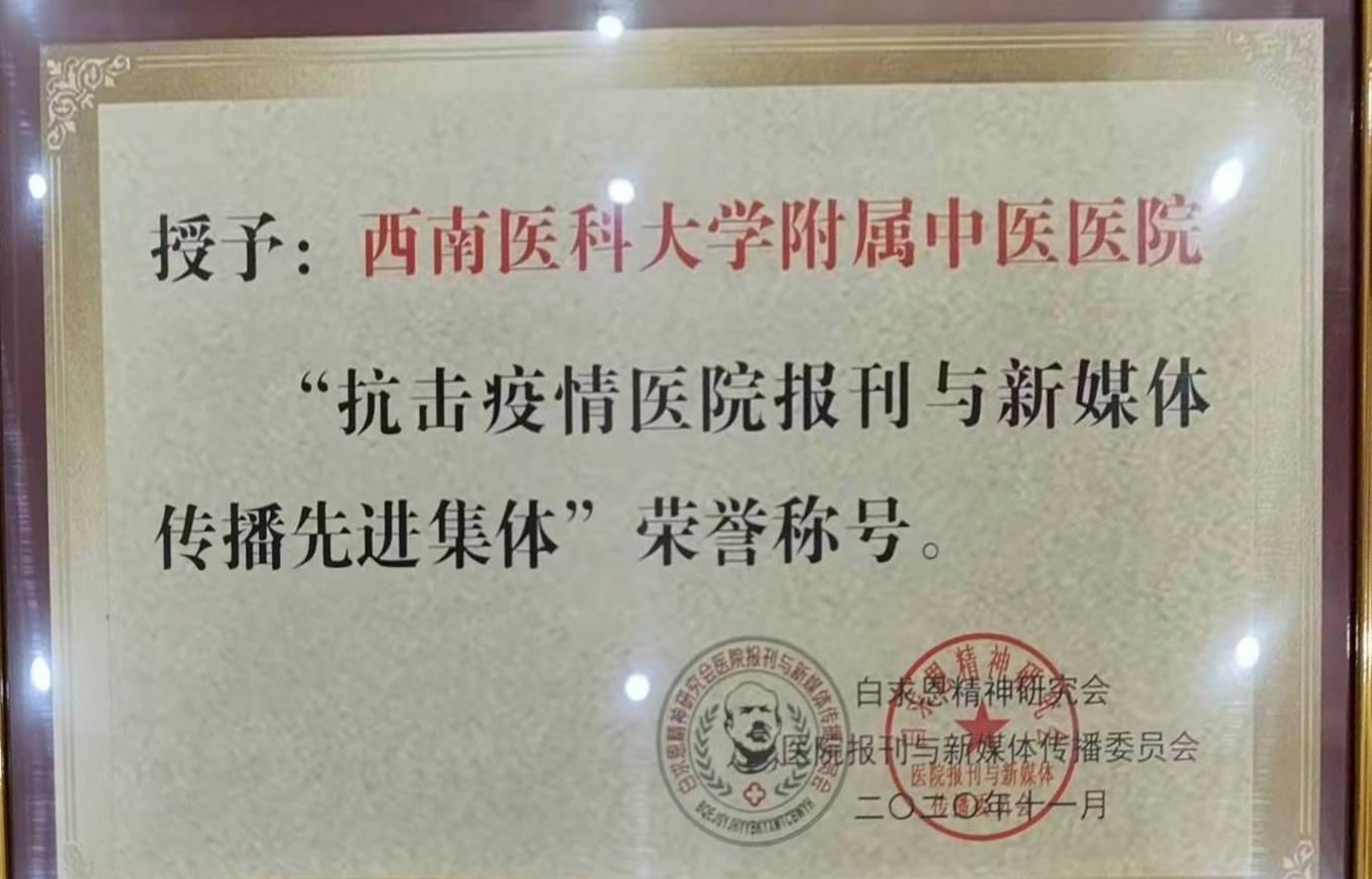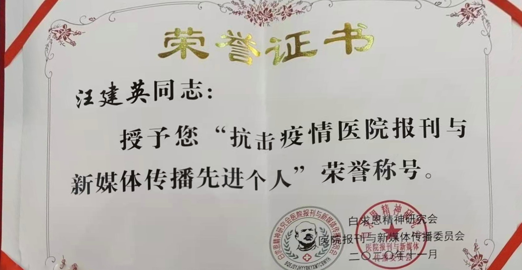 2020年11月11-13日,白求恩精神研究会医院报刊与新媒体传播委员会成立大会暨党建引领新时代医院报刊与新媒体传播白求恩精神文化论坛在河北石家庄召开。来自全国各地100余名从事医院管理及宣传工作人员参会,我院荣获“抗击疫情医院报刊与新媒体传播先进集体”荣誉称号,宣传部部长汪建英荣获“抗击疫情医院报刊与新媒体传播先进个人”荣誉称号。