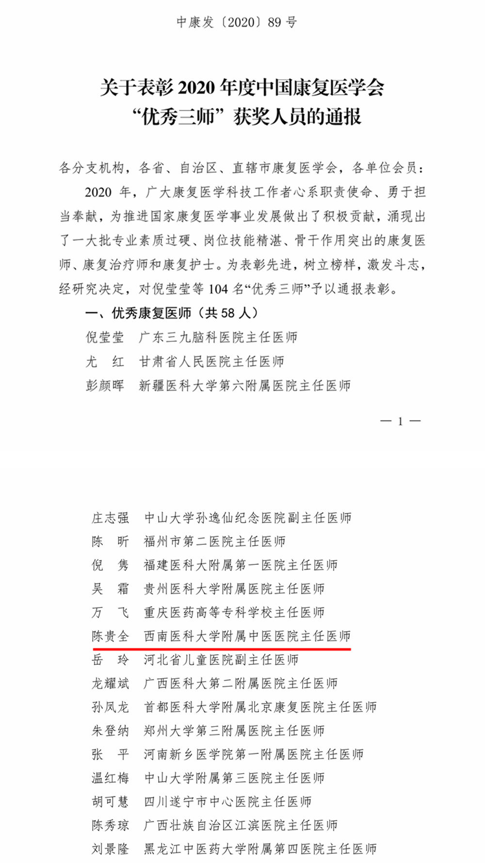 近日,中国康复医学发布了关于表彰2020年度中国康复医学会“优秀三师”获奖人员的通报。我院针灸·康复科主任陈贵全教授荣获“优秀康复医师”称号。