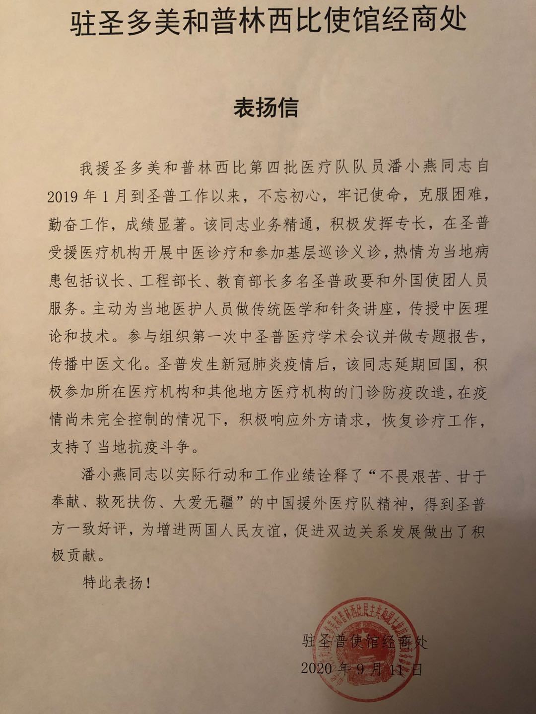 我院针灸·康复科潘小燕于2019年1月赴圣多美和普林西比开展医疗援外工作,期间充分发挥中医药特色优势,积极开展中医诊疗和参加基层巡诊义诊,为当地医护人员做传统医学和针灸讲座,传授中医理论和技术等,获得圣普卫生部和驻圣普使馆经商处好评。