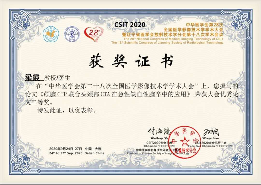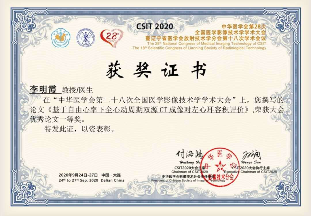 2020年9月24-27日,中华医学会第二十八次全国医学影像技术学学术大会在辽宁省大连市召开,我院放射影像科李明霞的论文《基于自由心率下全心动周期双源CT成像对左心耳容积评价》荣获大会优秀论文一等奖,放射影像科梁霞的论文《颅脑CTP联合头颈部CTA在急性缺血性脑卒中的应用》荣获大会优秀论文二等奖。