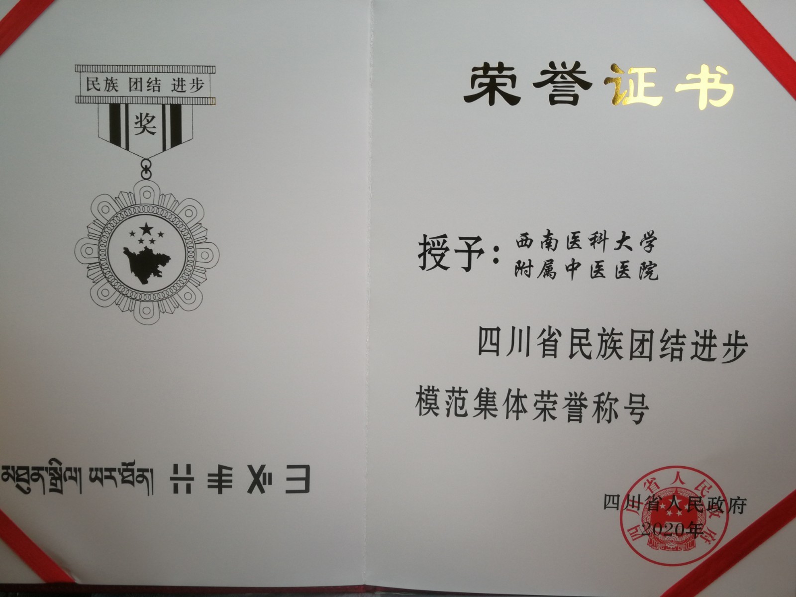 近日,四川省人民政府发布了《关于表彰四川省民族团结进步模范集体和模范个人的决定》,我院荣获四川省民族团结进步模范集体荣誉称号。