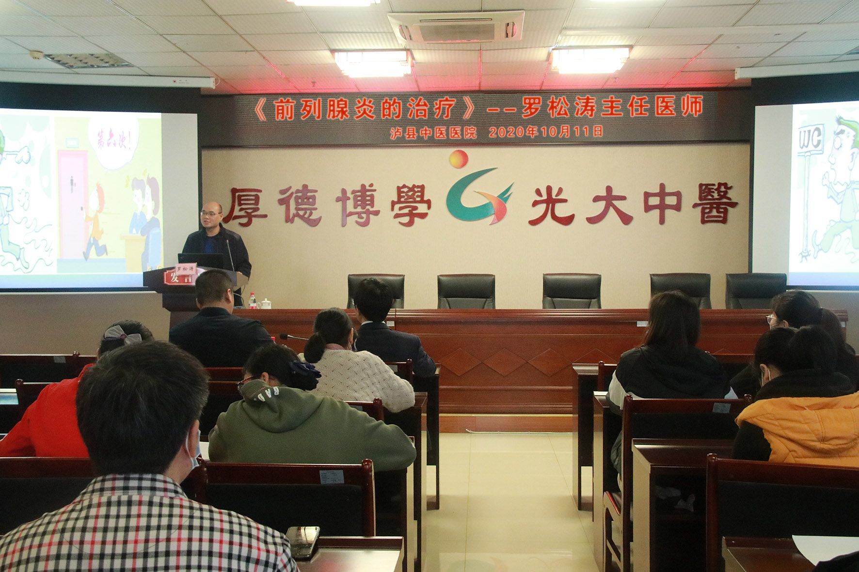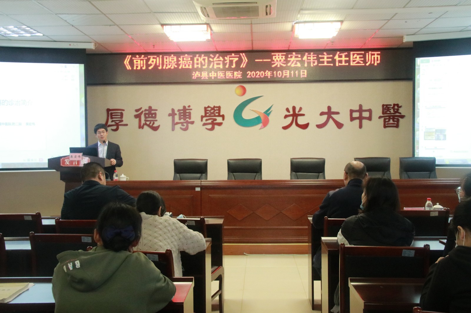 2020年10月11日,我院大外科主任兼泌尿外科主任粟宏伟教授、泌尿外科副主任朱永生副教授、泌尿外科主任助理罗松涛教授、刘星主治医师及相关护理人员到泸县中医医院开展了前列腺健康筛查联合义诊活动并在泸县中医医院市级继教会议上作专题讲座。