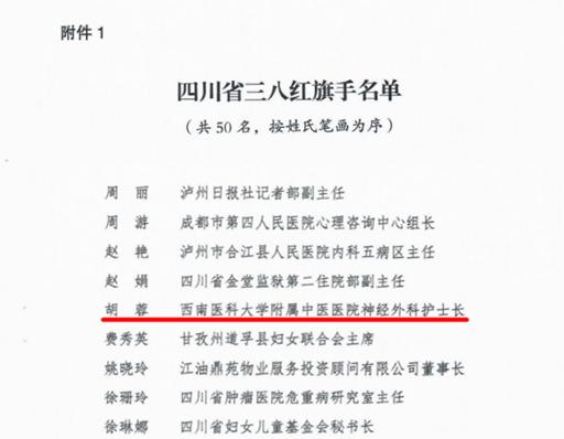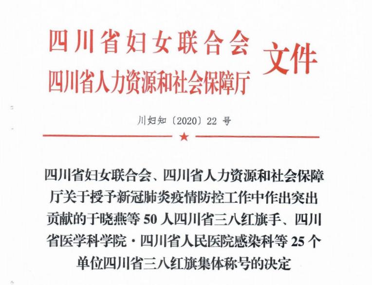 近日,我院收到了四川省妇女联合会和四川省人力资源和社会保障厅关于授予新冠肺炎疫情防控工作中作出突出贡献的集体和个人“四川省三八红旗手”荣誉称号的决定文件。我院援鄂护士、神经外科护士长胡蓉副主任护师荣获“四川省三八红旗手”荣誉称号。