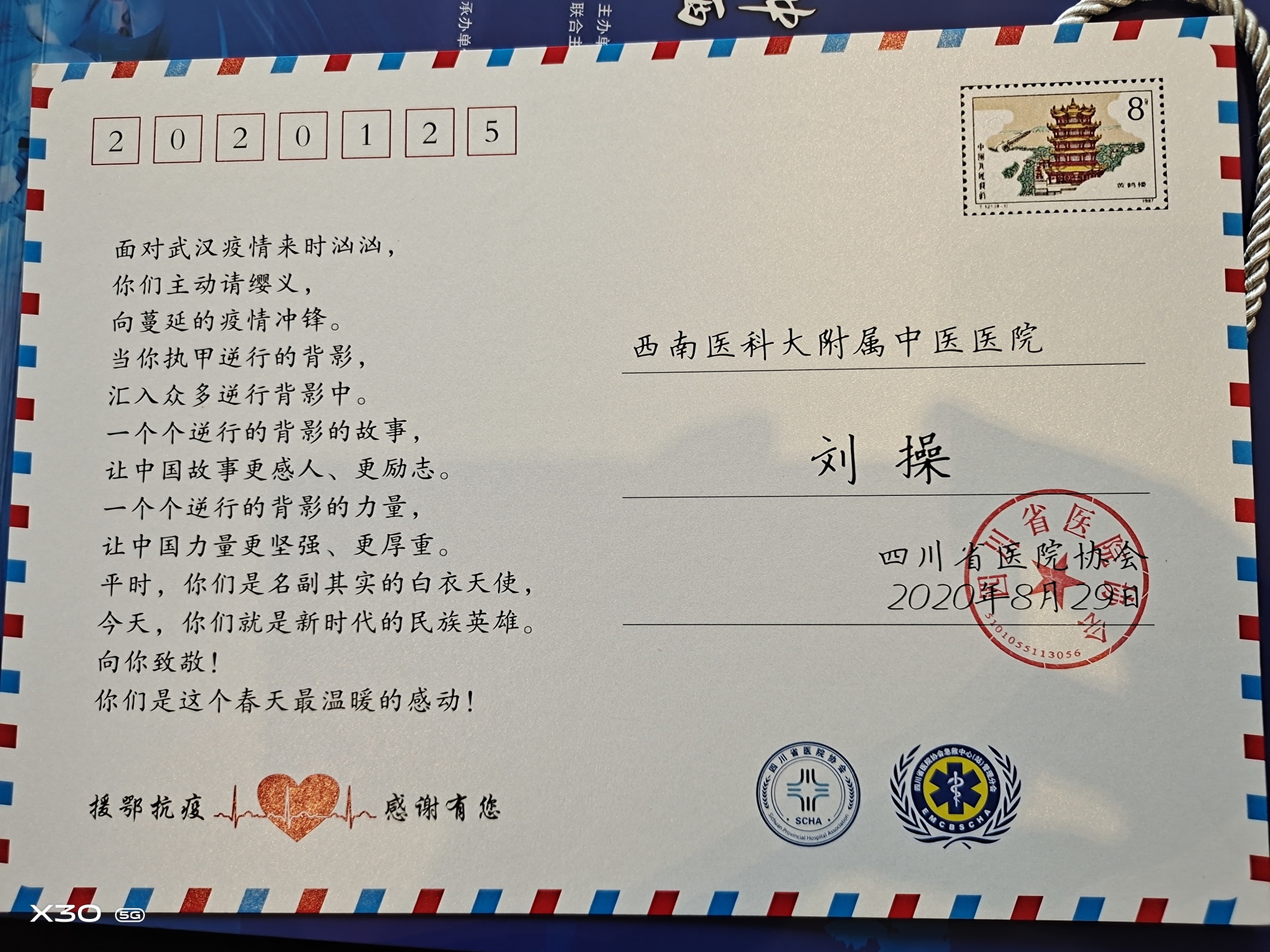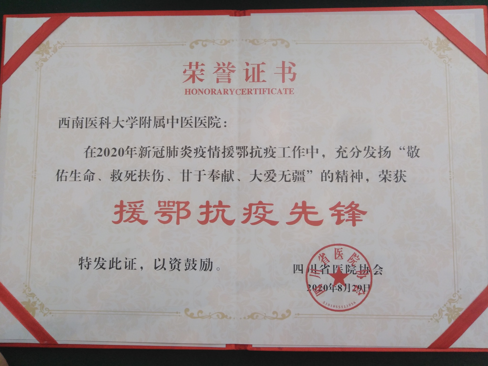 2020年8月28-30日,由四川省医院协会主办的中国西部第三届院前急救学术高峰论坛在成都召开,会上公布了抗疫先进集体和个人名单,我院荣获“援鄂抗疫先锋单位”荣誉称号,急诊科刘操主治医师荣获“援鄂抗疫先锋个人”荣誉称号。