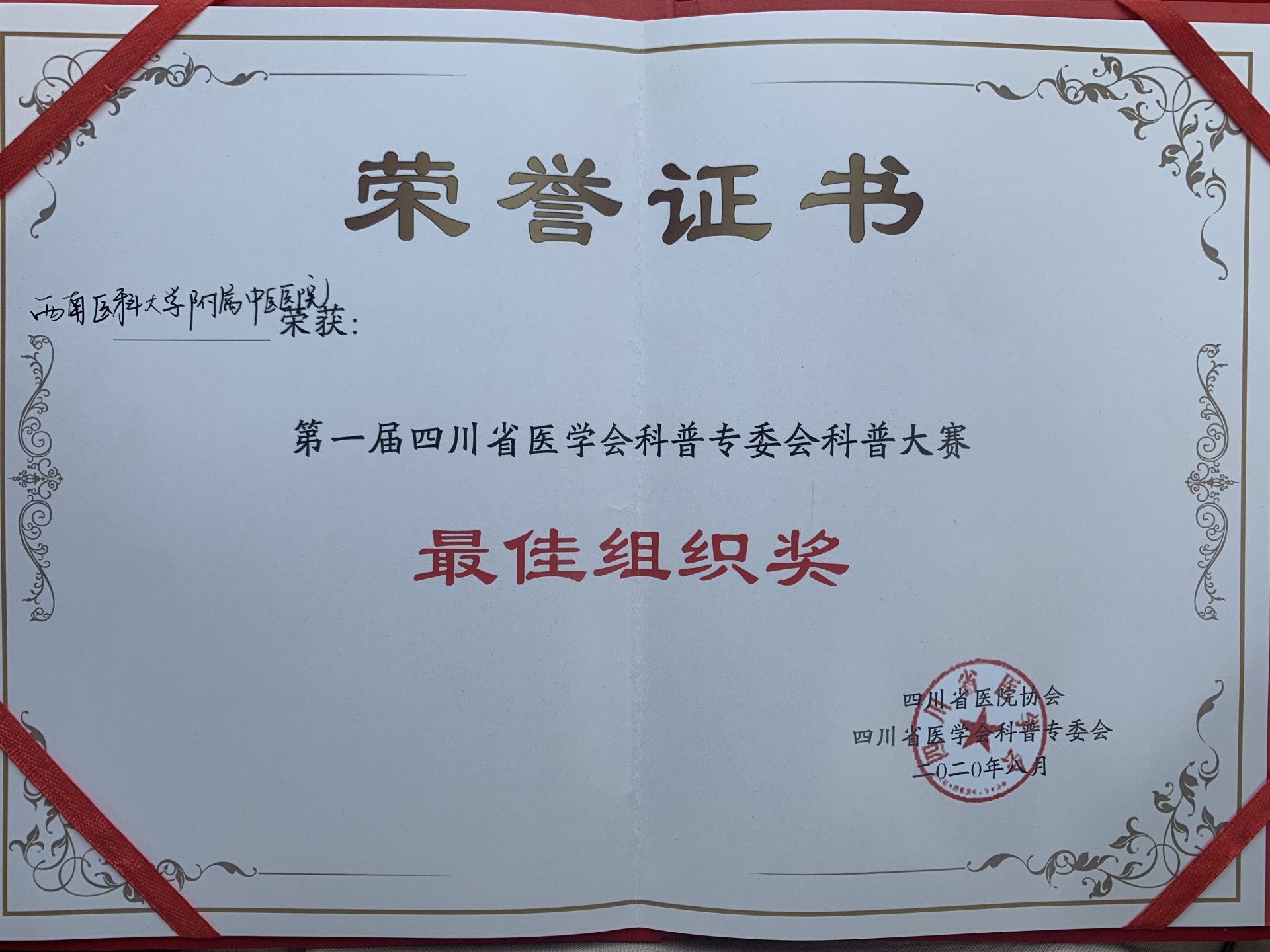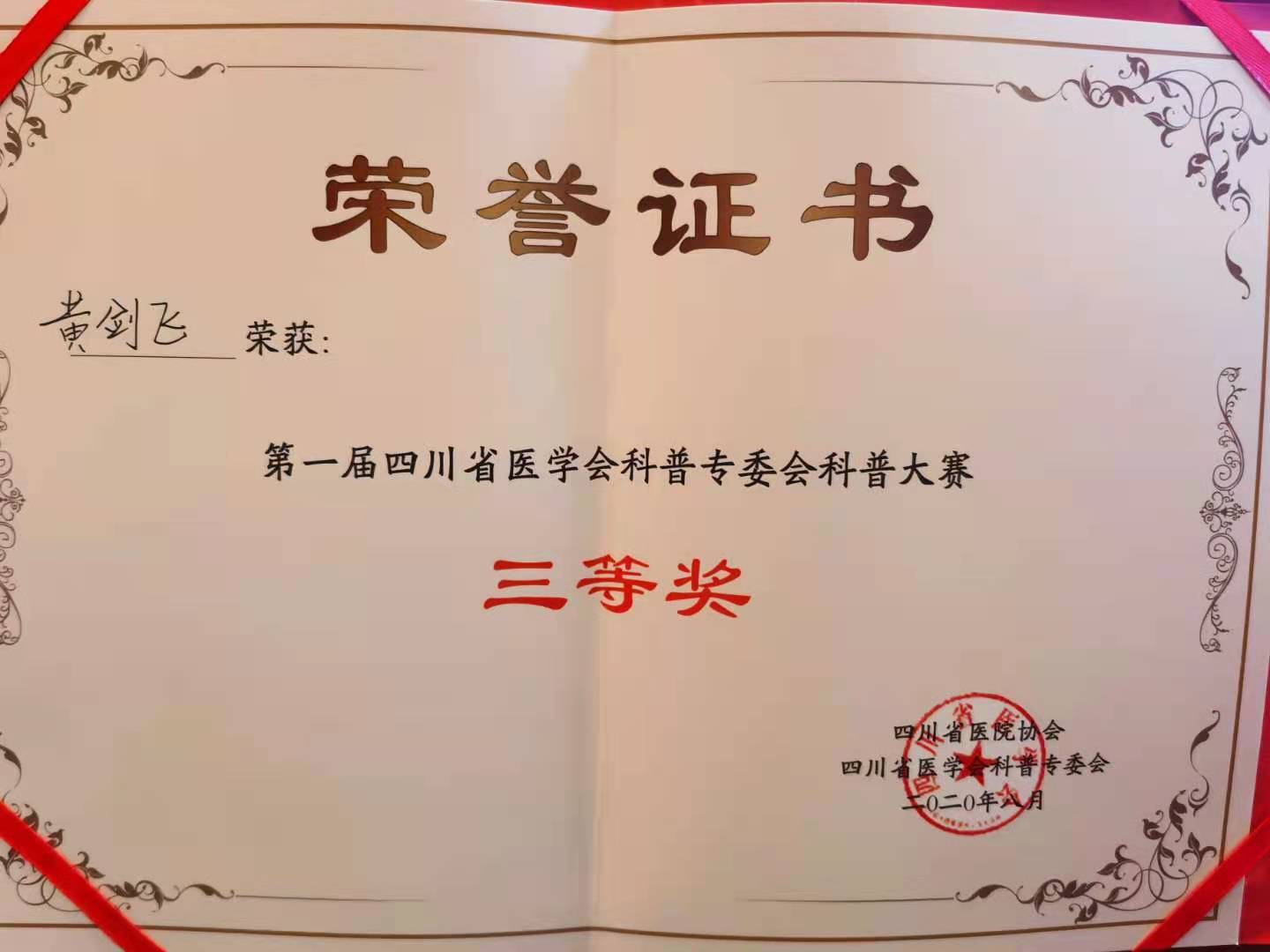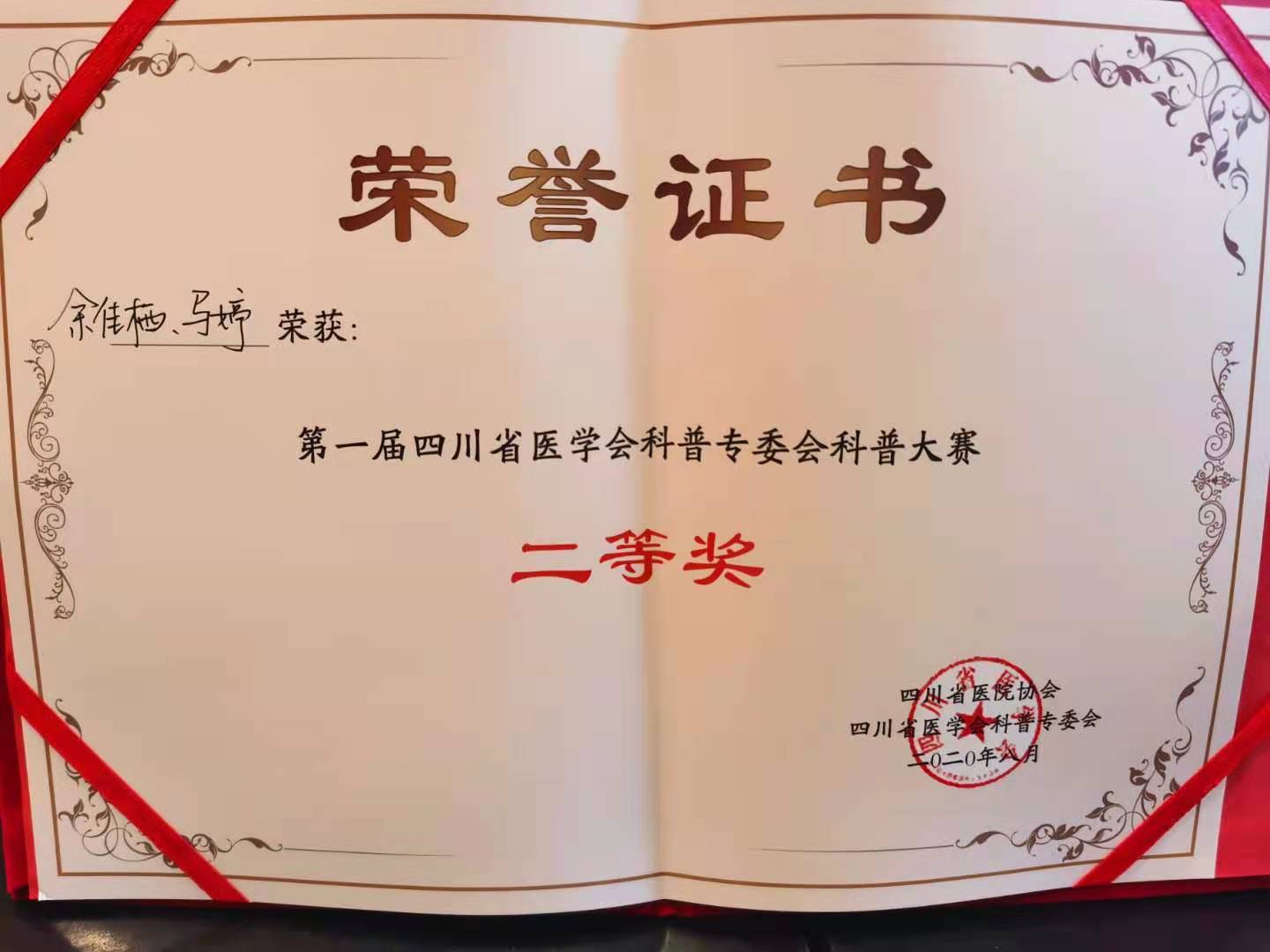 2020年8月29-30日,四川省医学会科学普及委员会成立大会暨第一次学术会在成都召开。我院院长助理徐厚平教授应邀作了《中医养心》专题讲座,我院荣获最佳组织奖,针灸·康复科余佳栖、马婷《滚蛋吧!疲劳君》荣获科普比赛二等奖,城北急诊科黄建飞《破伤风科普》荣获科普比赛三等奖。