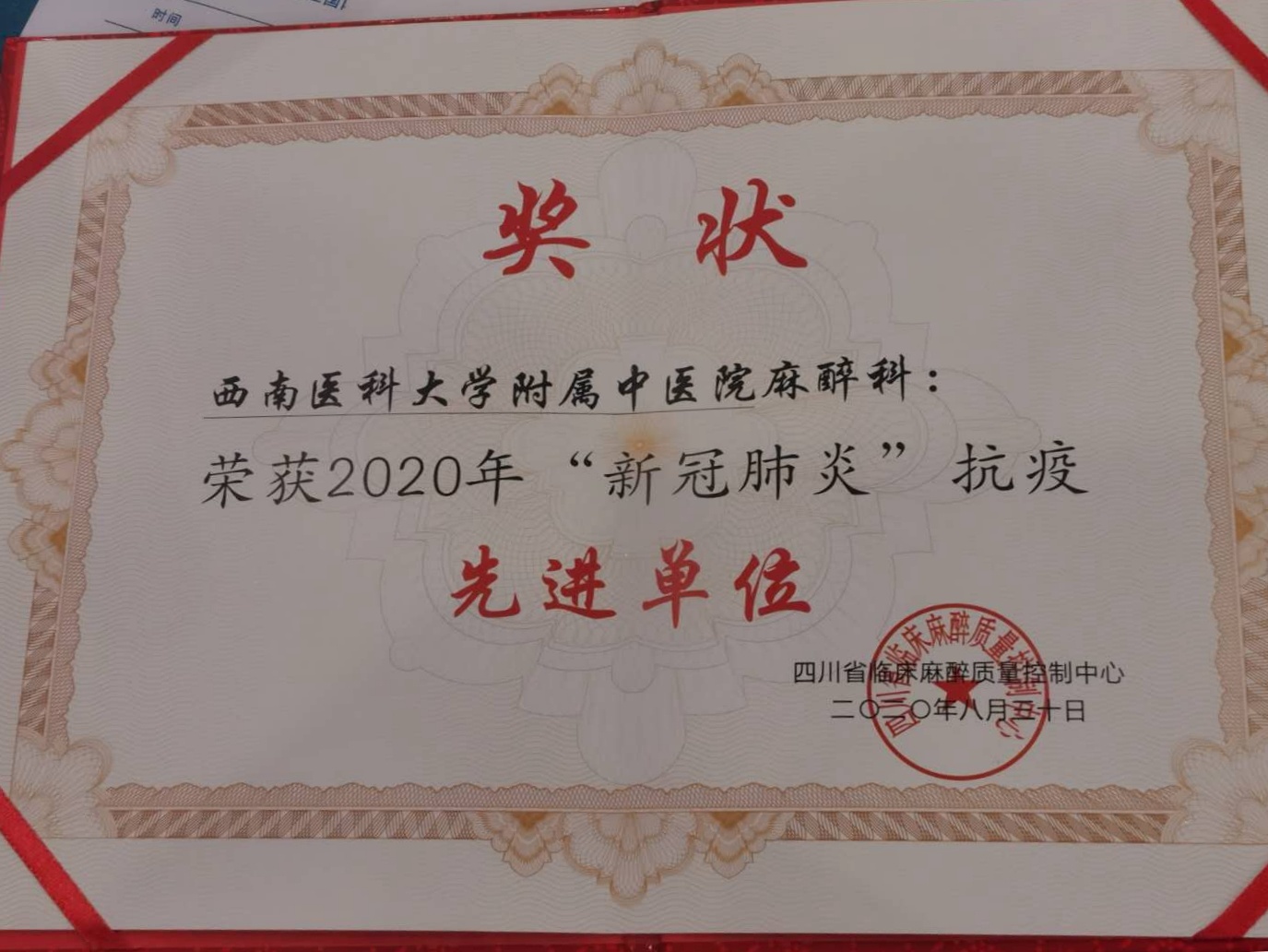 近日,我院麻醉科荣获四川省临床麻醉质量控制中心授予的“2020年‘新冠肺炎’抗疫先进单位”荣誉称号。