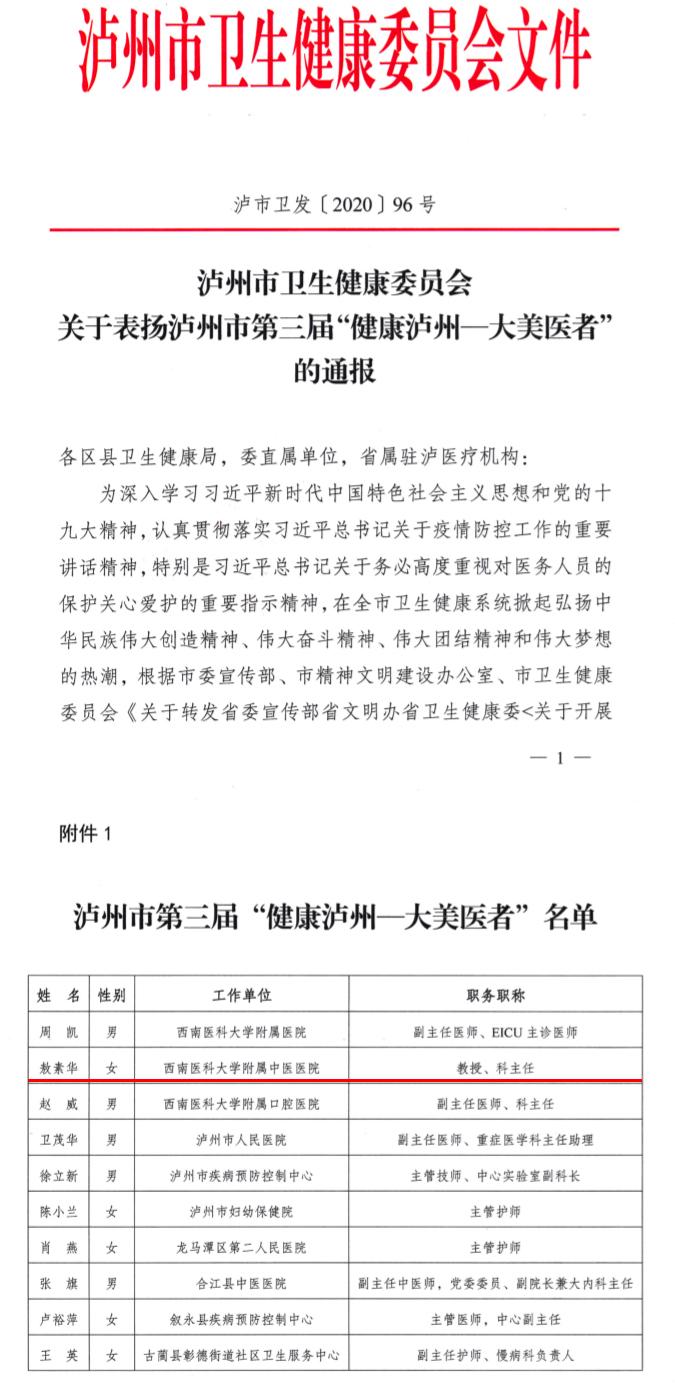 2020年8月20日,泸州市卫生健康委员会发布关于表扬泸州市第三届“健康泸州-大美医者”的通报,我院呼吸内科主任敖素华教授荣获“健康泸州-大美医者”荣誉称号。