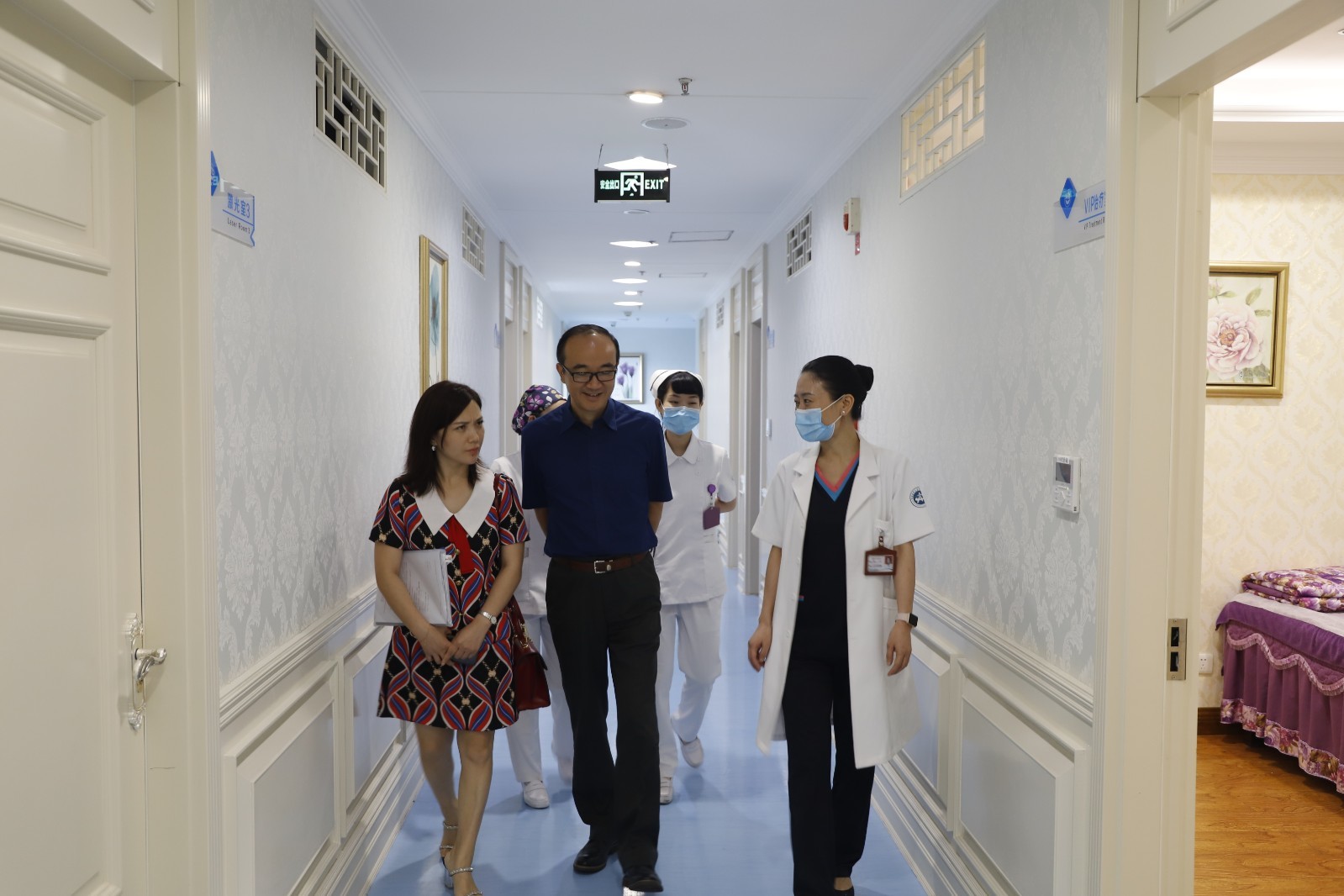 庄一强一行在医院相关职能部门人员的陪同下参观了医院门诊中庭、名医馆、中医药文化·院史博物馆、医学美容中心、健身中心等地。