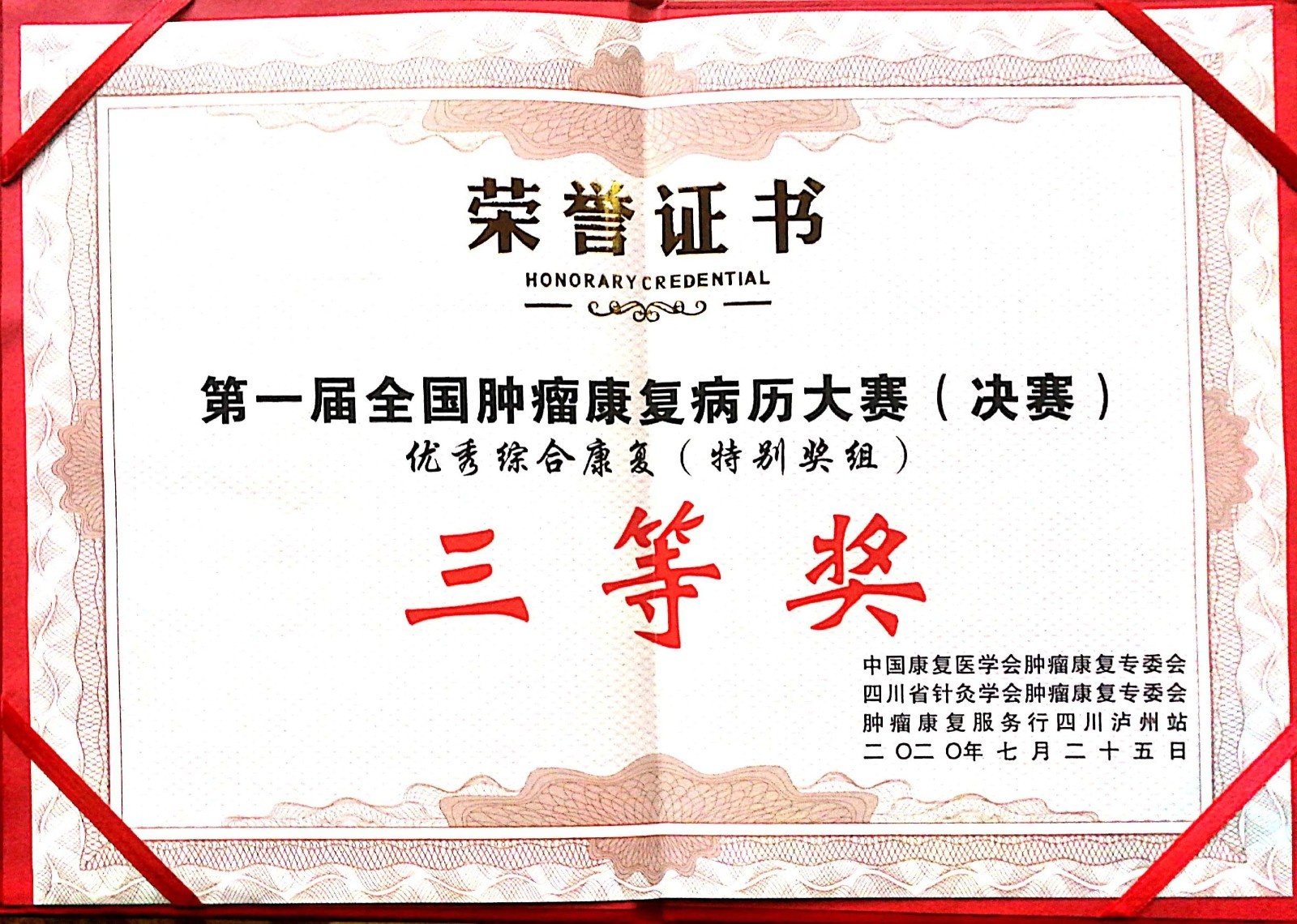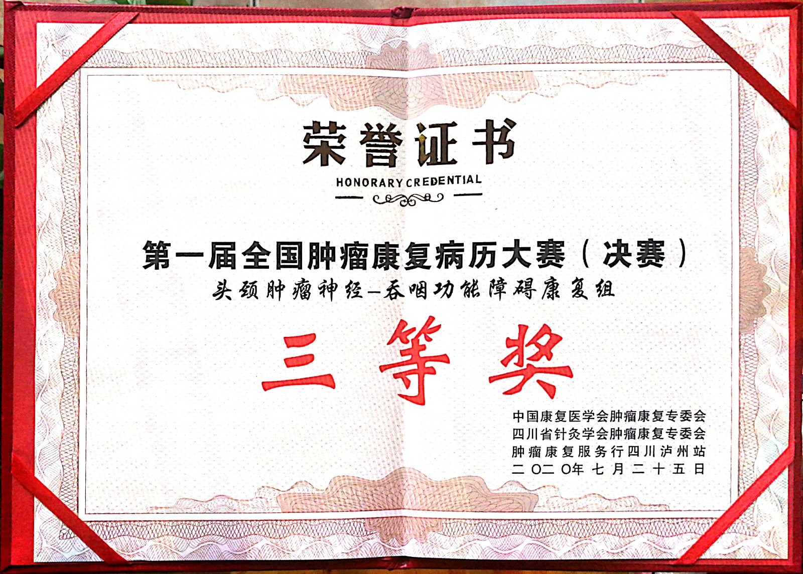 7月25日下午,在第一届全国肿瘤康复病例大赛上,我院针灸·康复科陈利莎、梁诗志、穆云蔚组成的头颈肿瘤神经-吞咽功能障碍康复组,林思睿、陈虹伊、黄俊宇组成的综合康复组分别以《吞咽功能障碍的综合治疗——一例颅脑肿瘤患者的病例分享》《胃肠功能障碍康复——一例肺癌放疗后病例的分享》荣获神经-吞咽组、综合康复组三等奖。