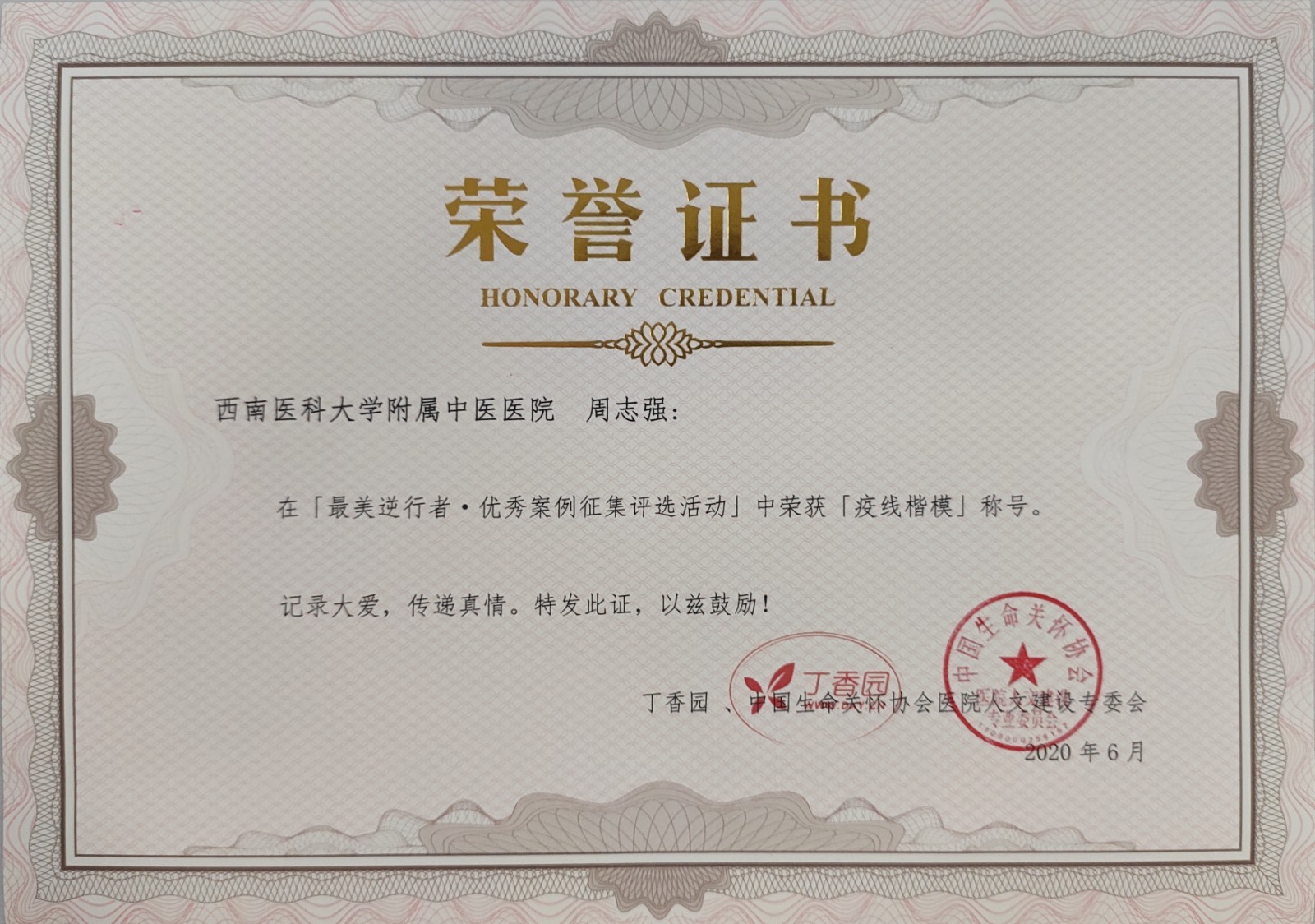 近日,在丁香园、中国生命关怀协会医院人文建设专委会联合举办的“最美逆行者·优秀案例征集评选活动”中,我院骨伤科(脊柱·骨肿瘤组)周志强荣获“疫线楷模”荣誉称号。