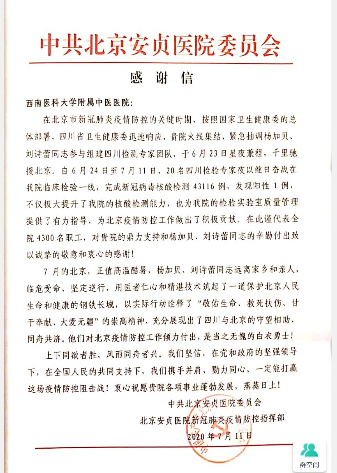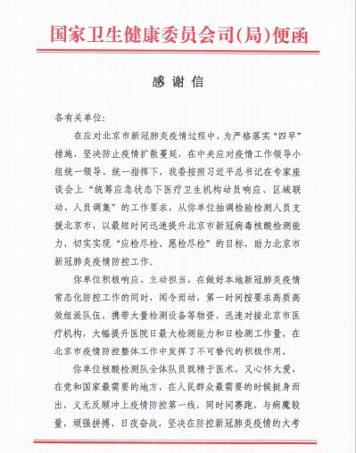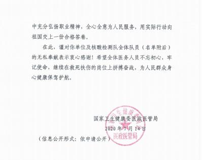 7月16日,国家卫健委医政医管局和北京安贞医院发来感谢信,对我院医疗队员的辛勤付出表示感谢。