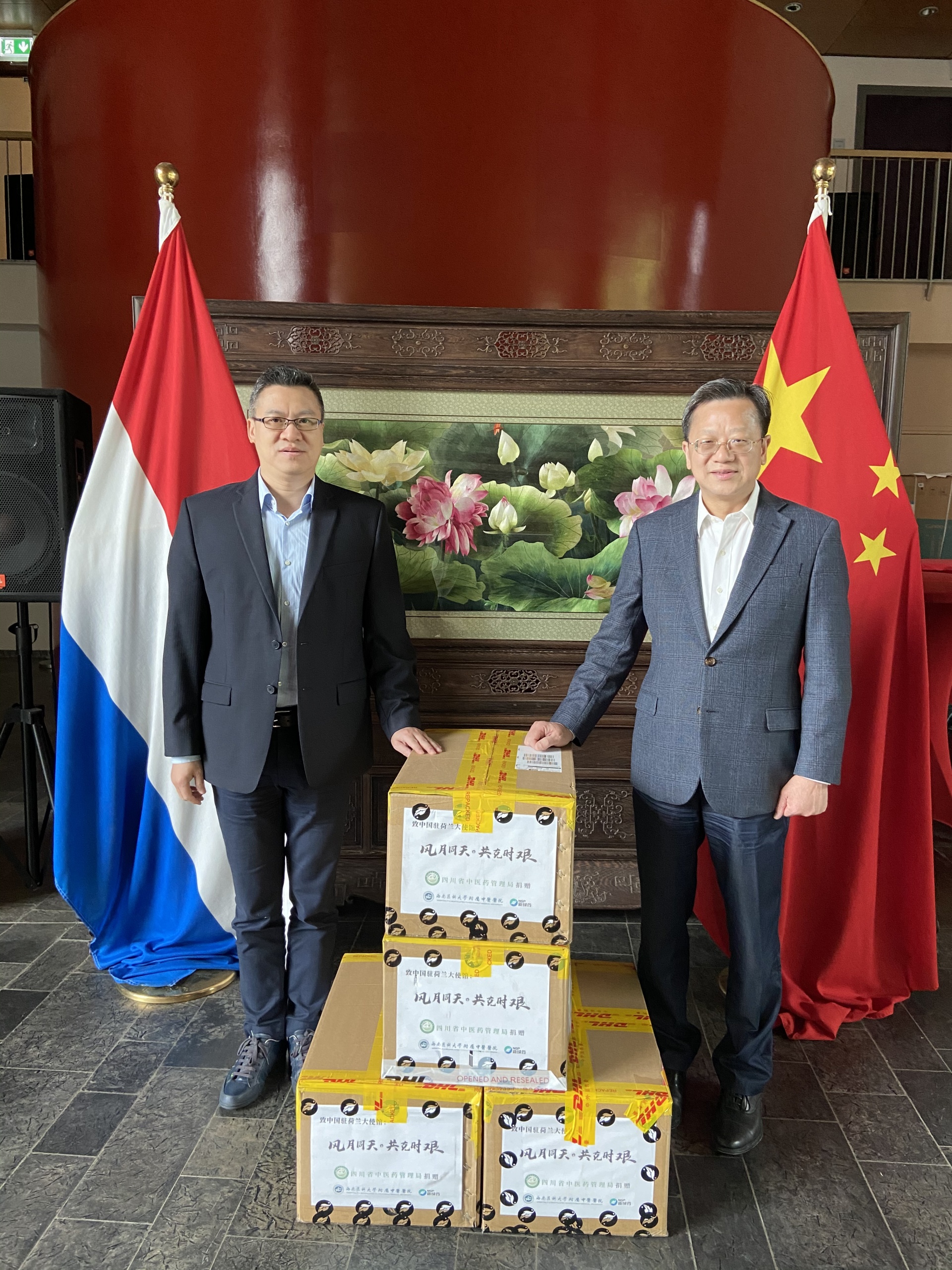近日,四川省中医药管理局统筹安排,联合我院及新绿色药业公司向中国驻荷兰大使馆捐赠了一批中药抗疫颗粒剂。大使馆收到中药后,发来照片与信息致谢。