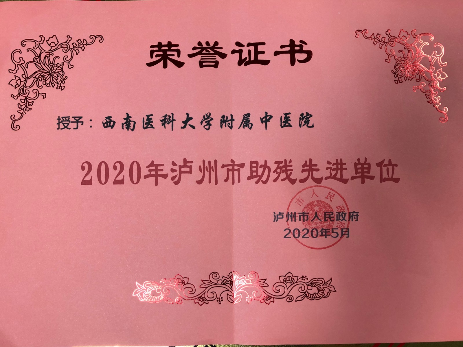近日,我院荣获泸州市人民政府“2020年泸州市先进助残单位”荣誉称号。