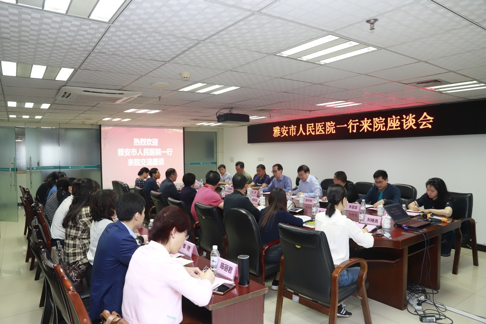 2020年5月27日,雅安市人民医院党委书记杜潇、党委副书记·院长邱雄一行来院交流,我院党委书记王琳等领导及相关职能部门负责人等参加了座谈会。会议由王琳书记主持。