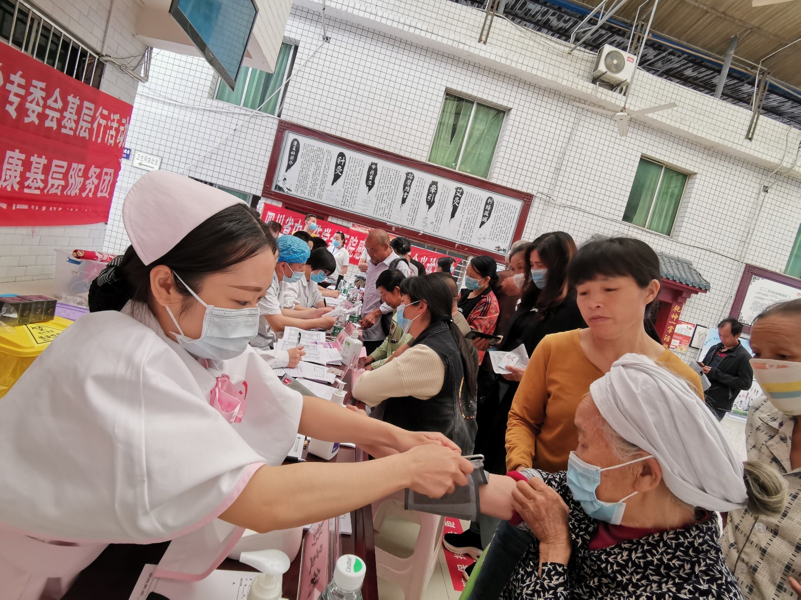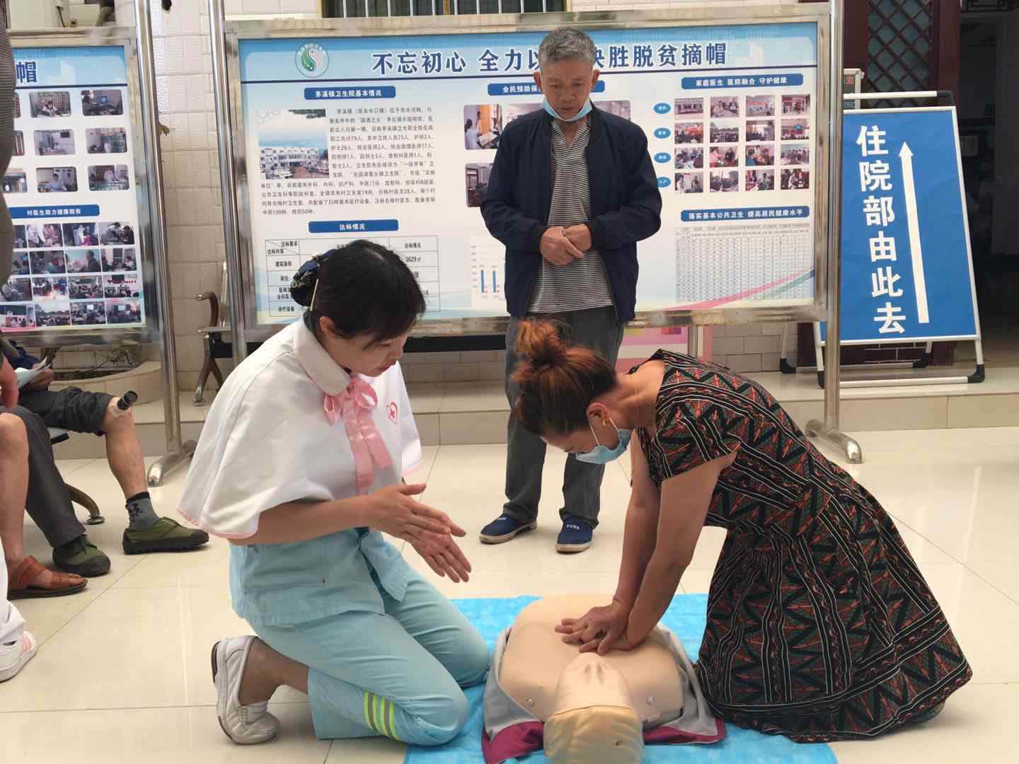 义诊现场,医护人员为当地群众测量血压、体验中医护理技术、发放相关疾病健康宣传资料等,并现场教学了心肺复苏和七步洗手法。