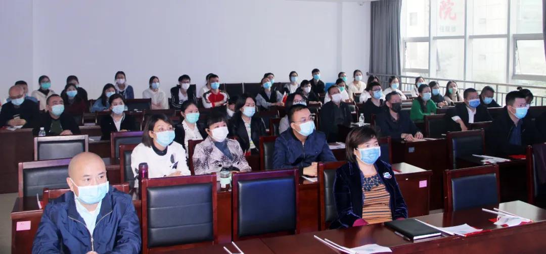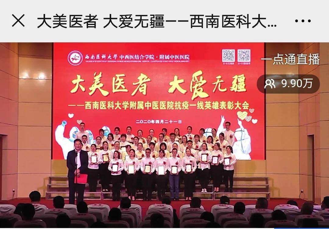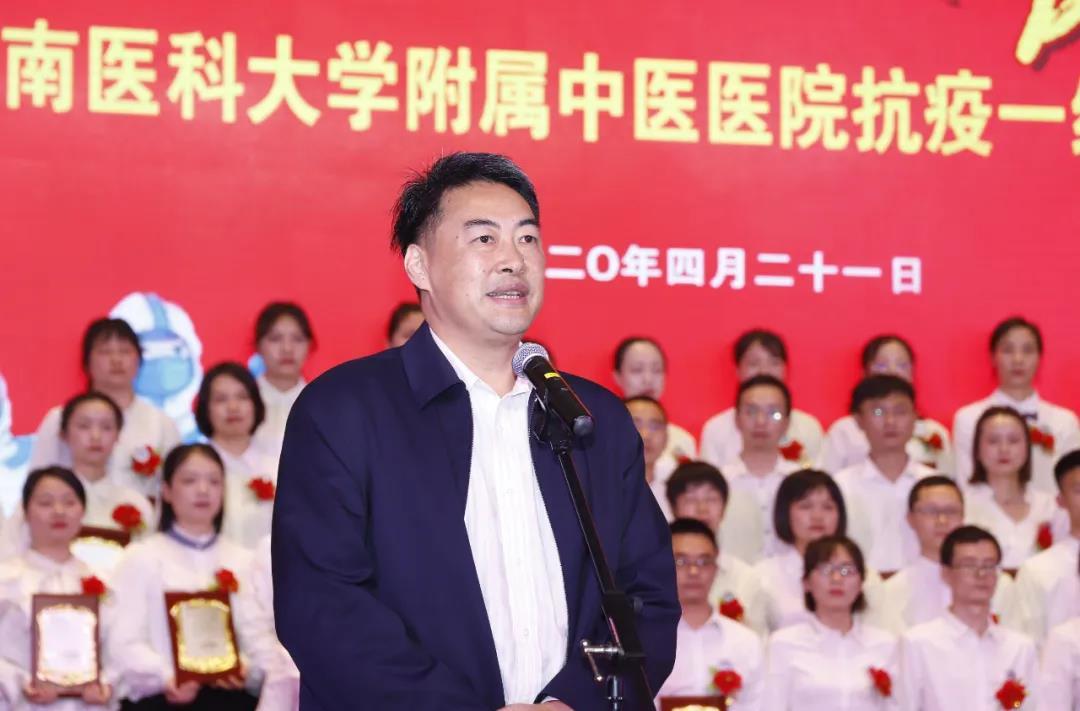 廖斌讲话,他代表西南医科大学向抗疫一线英雄主动请缨、舍身忘我,义无反顾奔赴到战斗最前线表示诚挚的问候和衷心的感谢,并对我院在此次抗击新冠肺炎疫情中充分发挥中医药特色优势,精准施策救治患者所取得的成绩给予了充分肯定。希望全校干部职工继续用实际行动诠释“不忘初心,牢记使命”的精神,展现医务人员“救死扶伤、医者仁心”的职业道德,展示医院“仁和精诚、佑护生命”的使命,为学校和医院事业发展作出积极贡献。