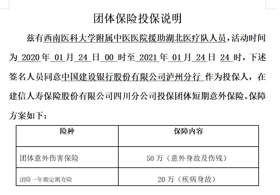 中国建设银行泸州支行和中国工商银行泸州支行为我院第一批赴武汉医疗救援队员购买意外保险,保障总额达每人150万元。
