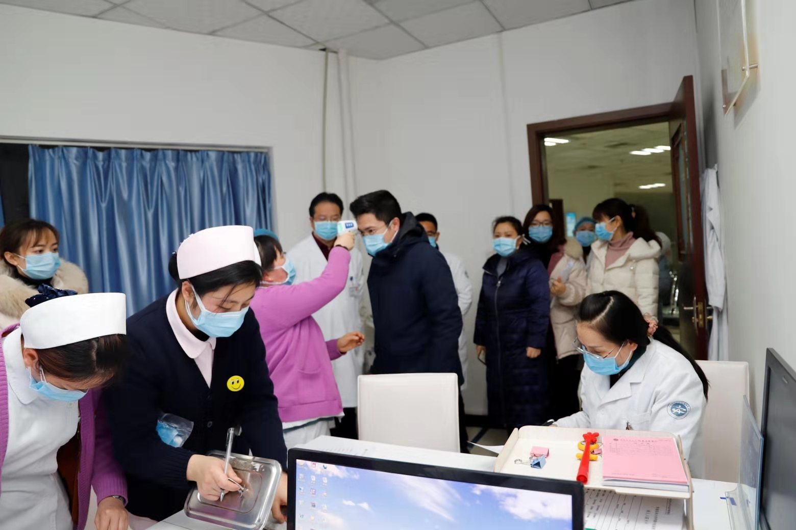 2020年1月26日上午,我院副院长李志带领医务部、护理部、感染管理办公室、门诊办公室等相关职能部门负责人及工作人员对医院预检分诊点、发热门诊等地进行了督查,对预检分诊点工作流程、发热门诊的优化设置、防护用品的配备等进行了检查,进一步强化了疫情防控相关工作管理流程。