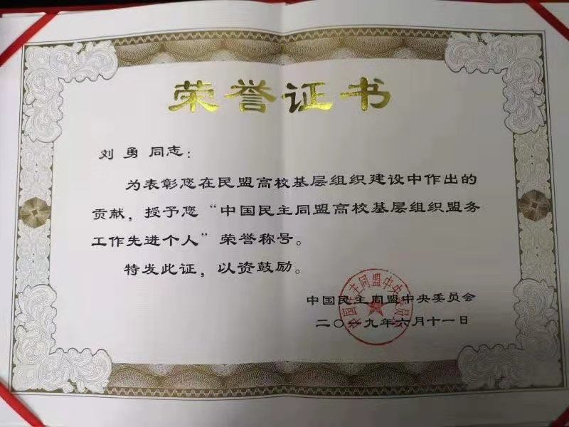 近日,我院放射影像科(核磁共振组)主任刘勇教授被中国民主同盟中央委员会授予“中国民主同盟高校基层组织盟务工作先进个人”荣誉称号。