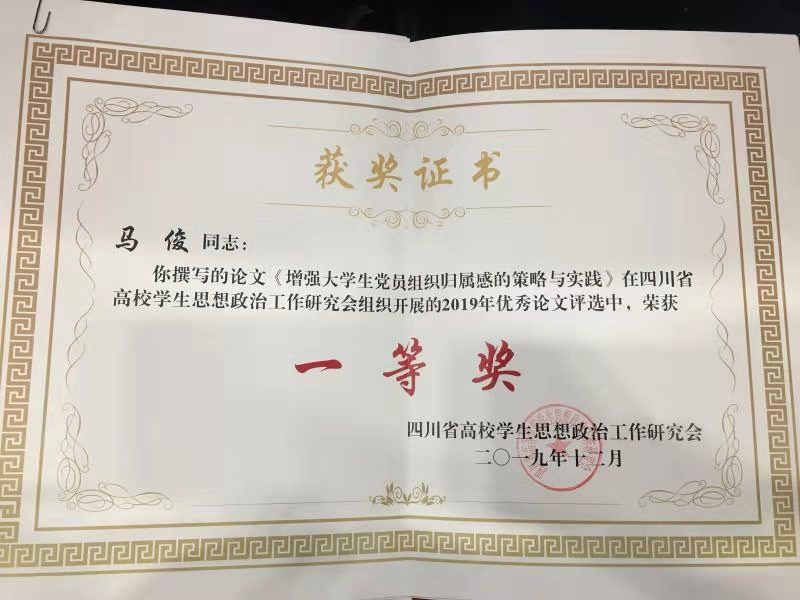 2020年1月7日,四川省高校学生思想政治工作研究会2019年年会在成都举行,会上对研究会2019年优秀论文进行了表彰,我院学生科科长马俊撰写的论文《增强大学生党员组织归属感的策略与实践》荣获一等奖。