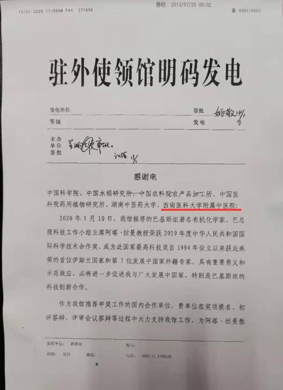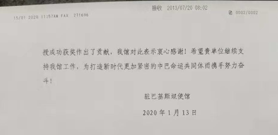 2020年1月13日,中国驻巴基斯坦使馆对我院发来感谢电。感谢我院等单位在巴基斯坦著名有机化学家、巴总理科技工作小组主席阿塔·拉曼教授荣获2019年度中华人民共和国国际科学技术合作奖奖项提名、初评答辩、评审会议答辩等过程中给予的大力支持。