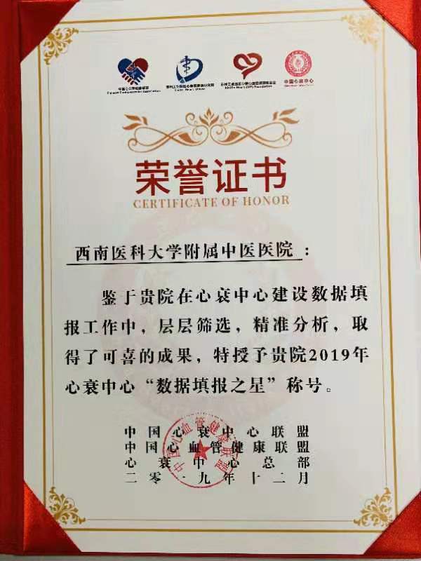2019年12月27日,心衰中心全国质控论坛与授牌表彰会在江苏苏州召开,我院心衰中心荣获“数据填报之星”荣誉称号。
