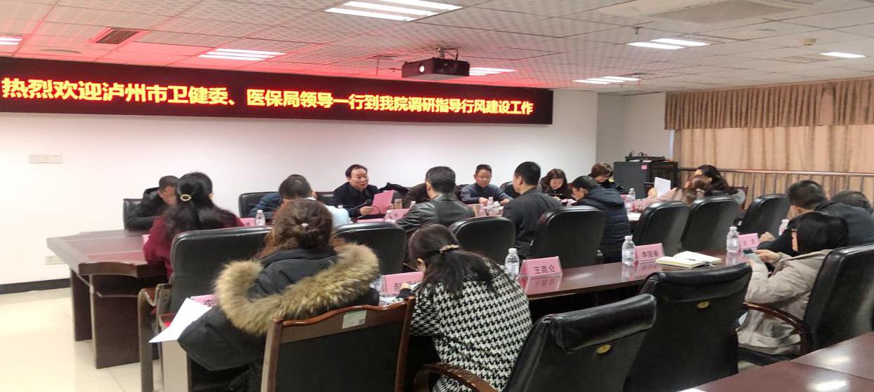 2020年1月8日,泸州市卫健委、医保局领导一行7人莅临我院调研指导行风建设工作,医院党委副书记兼纪委书记赵国强、副院长李志及相关职能部门负责人等参加了座谈会。会议由泸州市纪委派驻泸州市卫健委纪检组组长李明主持。