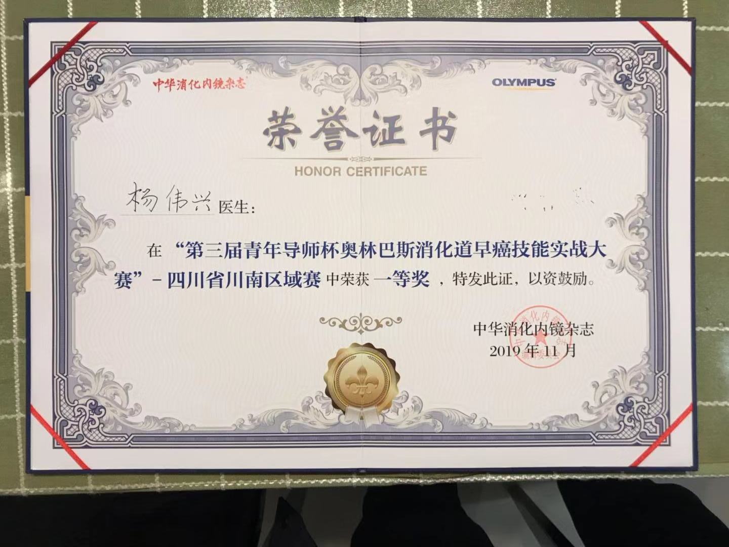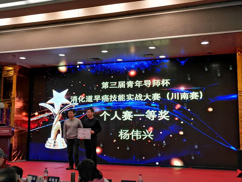 2019年12月28日,第三届青年导师杯暨奥林巴斯消化道早癌技能实战大赛——四川省川南区域赛在泸州召开,我院脾胃·风湿免疫病科杨伟兴副主任医师参加大赛并荣获一等奖。