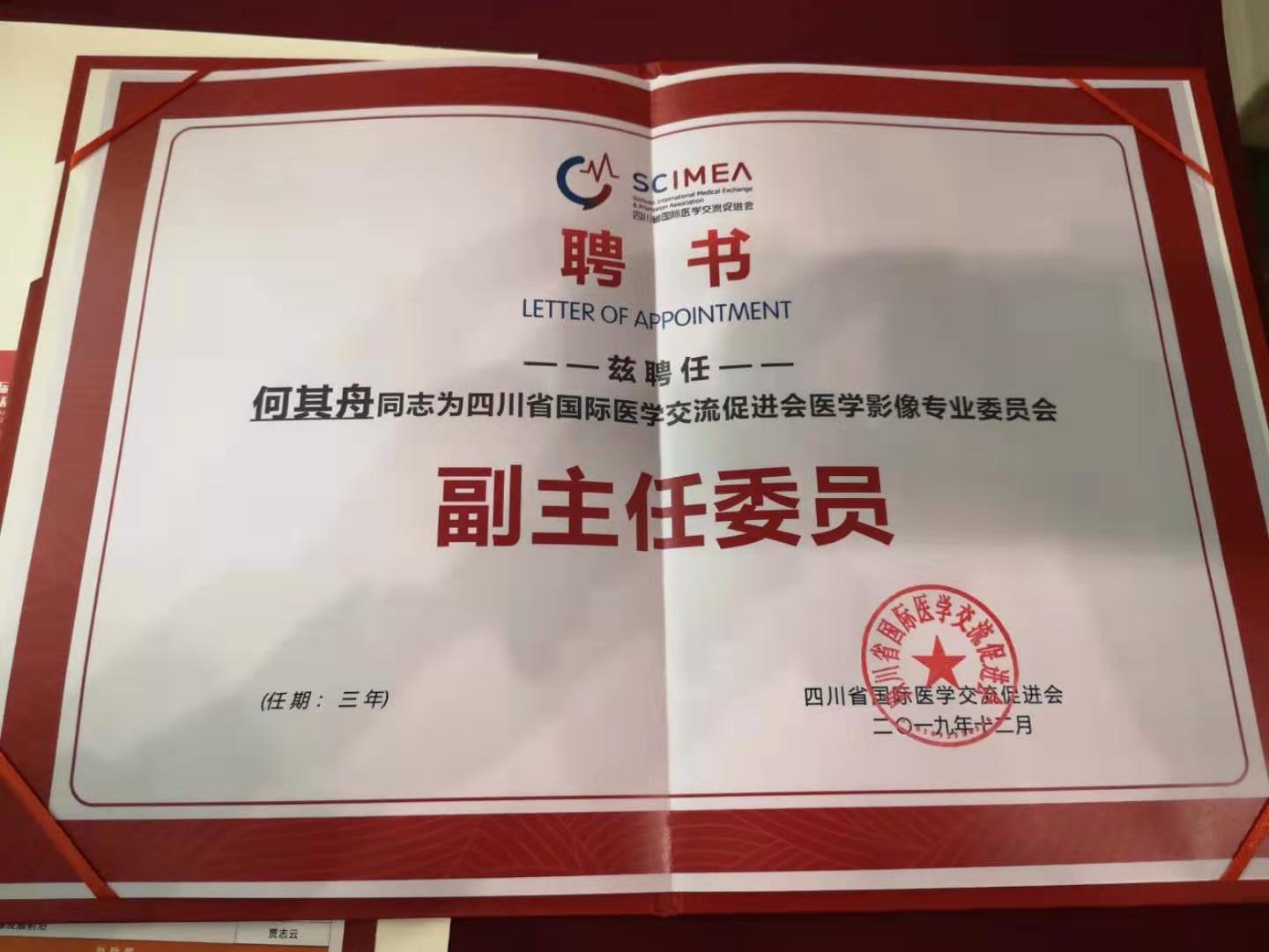 近日,我院放射影像科(CT·普放组)主任何其舟副教授受聘为四川省国际医学交流促进会医学影像专业委员会副主任委员。骨伤科(矫形·儿骨·手外组)罗旭超主治医师当选为中国中医药研究促进会骨伤科分会委员。