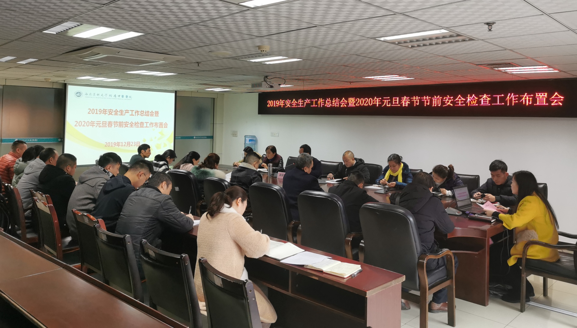 2019年12月23日,我院召开了2019年安全生产总结会暨2020年元旦春节节前安全检查工作布置会,医院党委副书记兼纪委书记赵国强主持会议,安全办、保卫部等相关部门人员参加会议。
