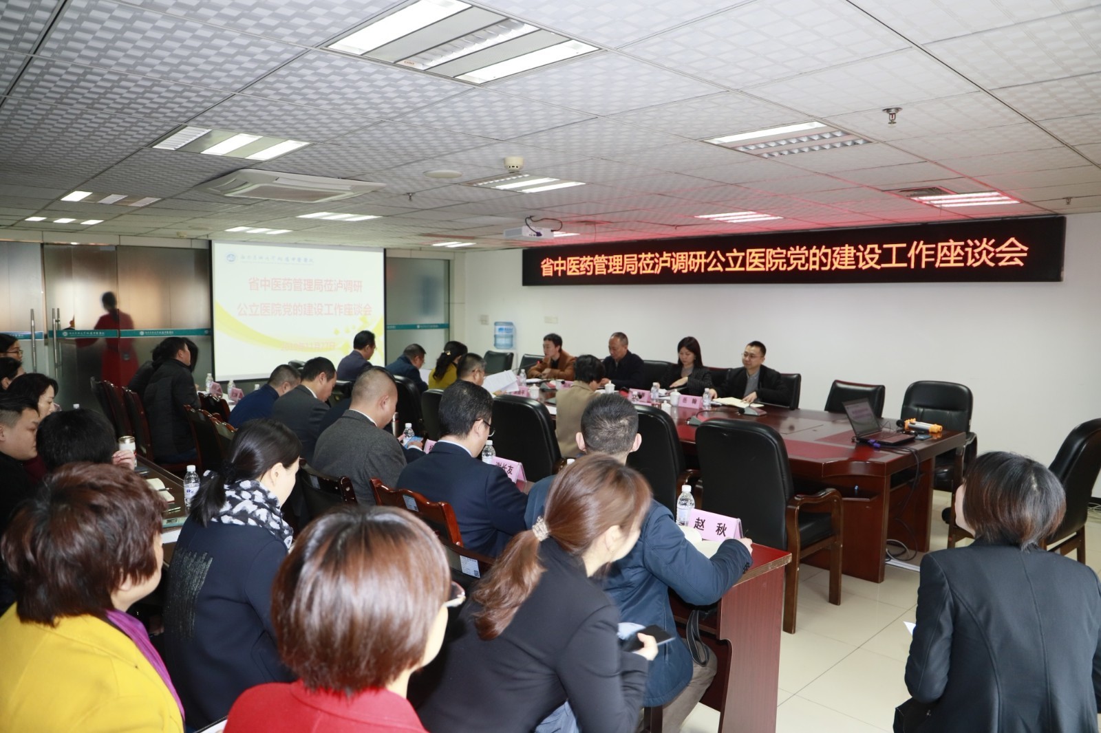 2019年11月27日,四川省中医药管理局党组书记、局长,省卫生健康委党组成员,省中医药科学院党委书记田兴军,四川省中医药管理局人事教育处处长刘晓蓉等省中医药管理局领导在西南医科大学副校长张春祥,泸州市卫生健康委党组书记、主任,市中医药管理局局长涂曲平等陪同下莅临泸州市调研工作,我院党委书记王琳等党政领导及相关职能部门负责人,泸州市中医医院党委书记、院长郑海三等参加了会议。会议由四川省中医药管理局办公室副主任张睿主持。