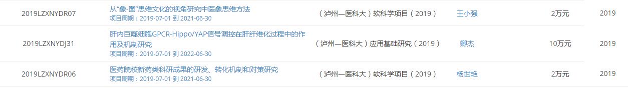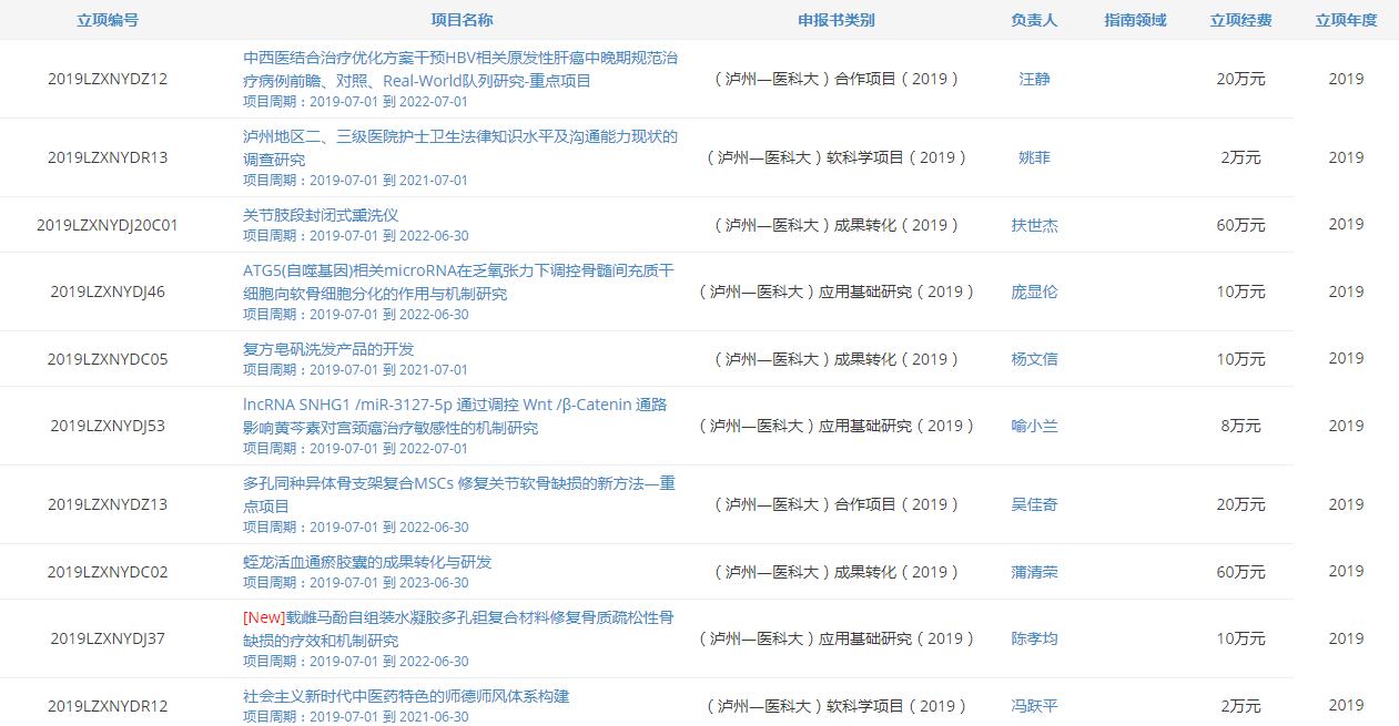 近日,2019年度泸州市人民政府-西南医科大学科技战略合作项目公布,我院13个科研项目获立项资助,资助总金额216万。