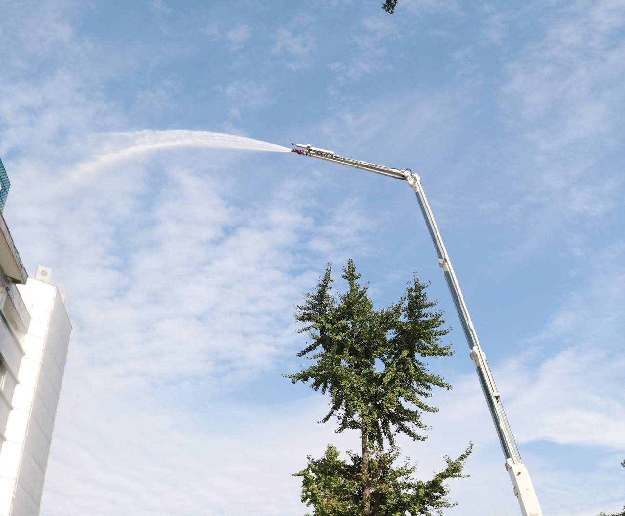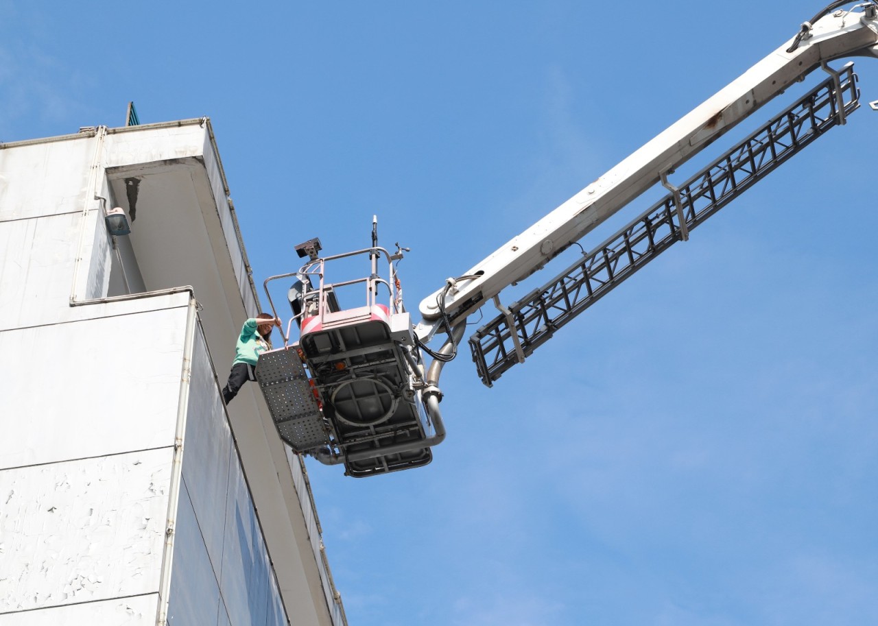 演练现场,泸州市消防支队特勤中队工作人员向参加演练的人员介绍了如何使用消防云梯和高空灭火消防车以及高空逃生自救常识。