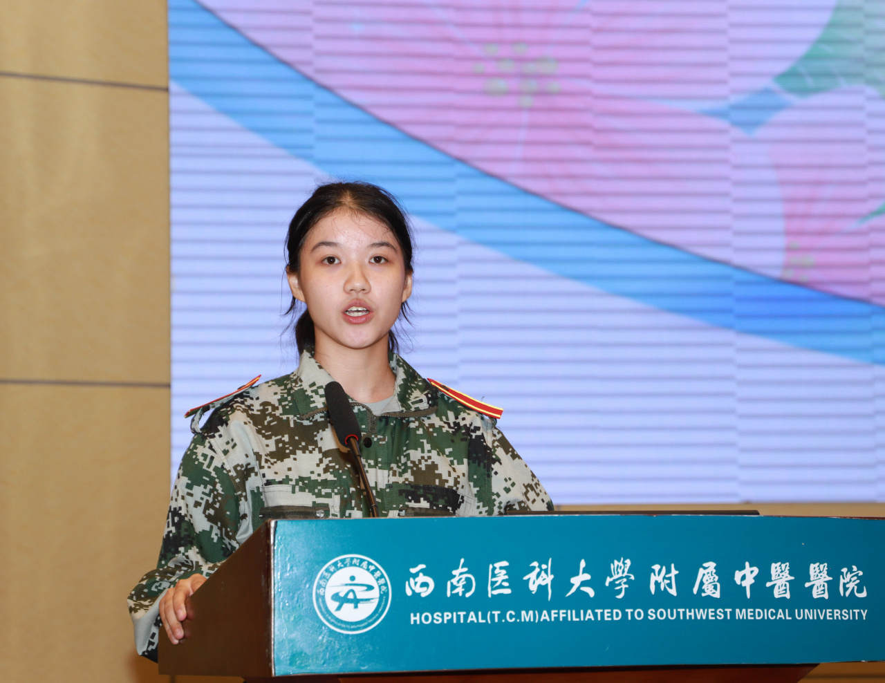 新生代表曾韵桃发言,她表示将在今后的学习中尊师重教,养成良好习惯,将理论与实践相结合,努力成为一名优秀的医学生。