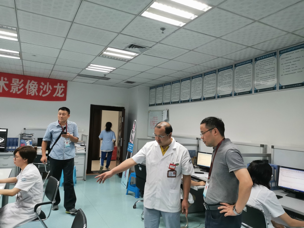 2019年9月10日,我院副院长刘建带领设备保障部相关人员,对医院CT、DSA、磁共振、直线加速器、头部伽玛刀等重大设备进行了安全检查,并对物资、医疗器械、体外诊断试剂库房的物资准备和规范性进行了指导。