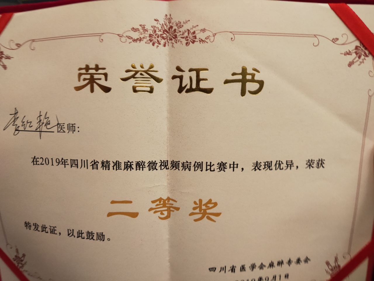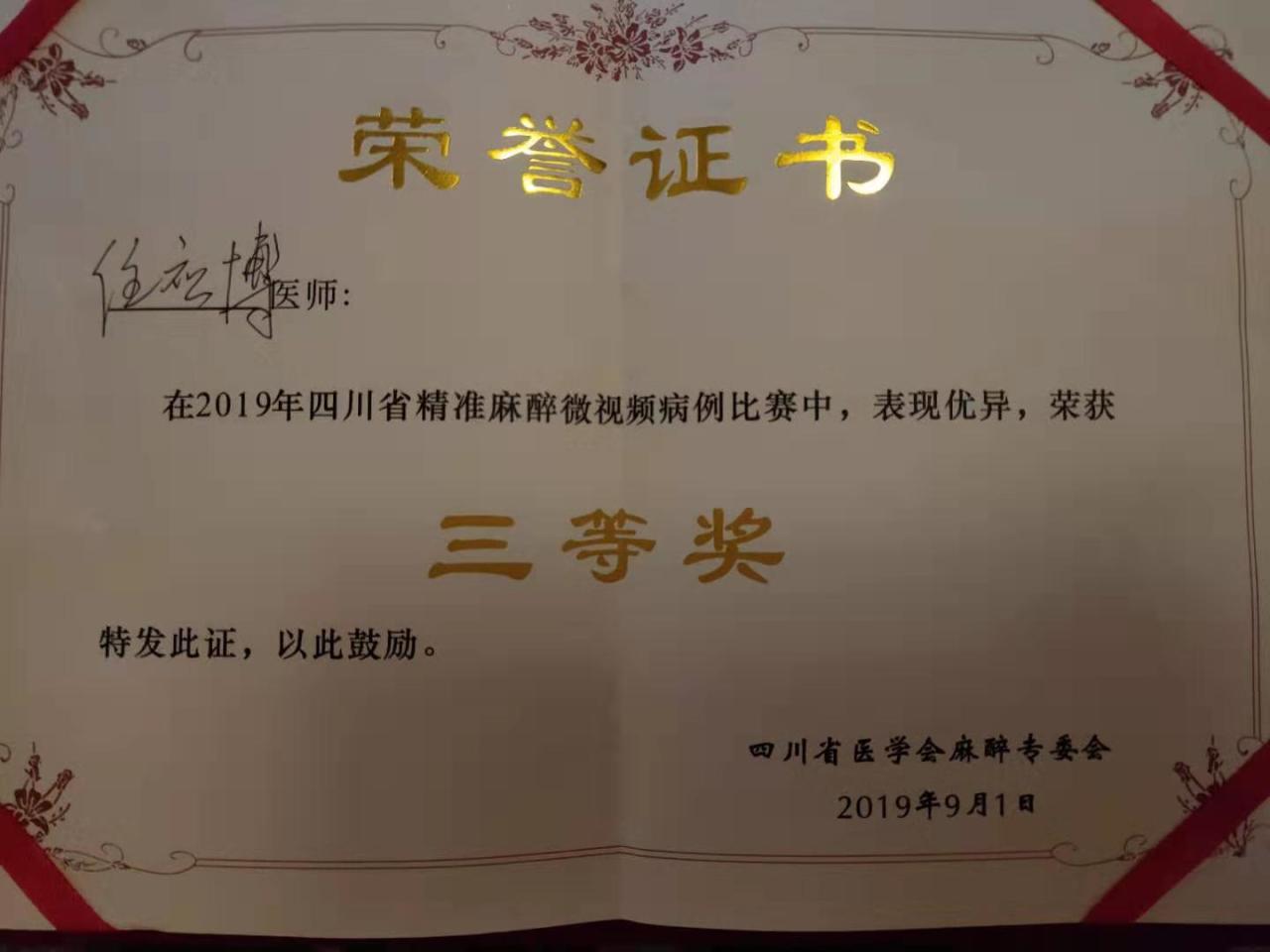 2019年9月1日,全国“精准麻醉微视频病例比赛”四川省赛区在成都举行,我院麻醉科医师李红艳、任应博荣获四川省赛区二等奖和三等奖,将代表四川省麻醉学分会参加西部区域赛。