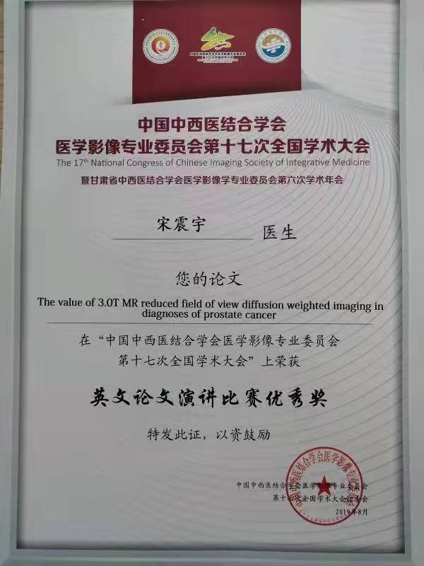 我院放射影像科(磁共振室)主任刘勇教授作了《多模态MR对乳腺癌诊断与临床应用进展》专题讲座,主治医师宋震宇撰写的论文《3.0TMR小视野扩散加权成像对前列腺癌的诊断价值》荣获英文论文演讲比赛优秀奖和优秀壁报交流奖。