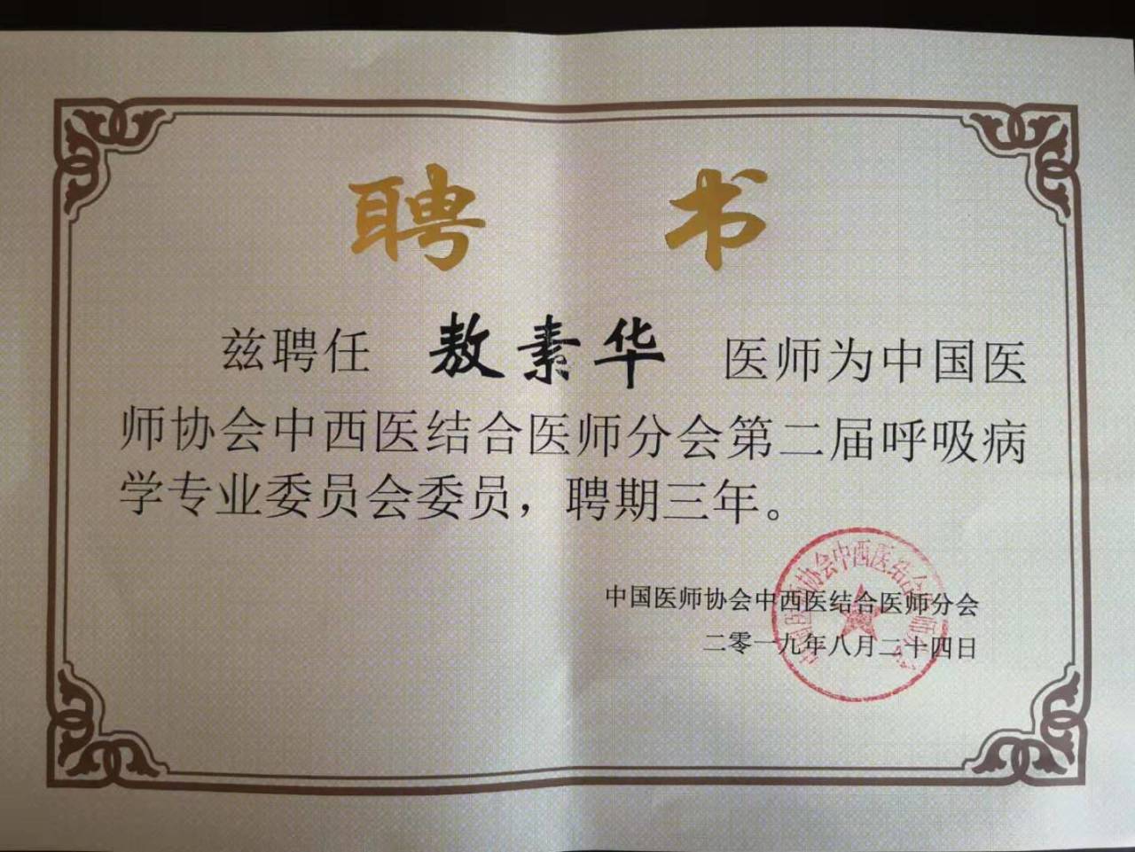 2019年8月24日,中国医师协会中西医结合医师分会呼吸病学专委会换届及学术交流会在北京召开,我院呼吸内科主任敖素华教授当选为委员。