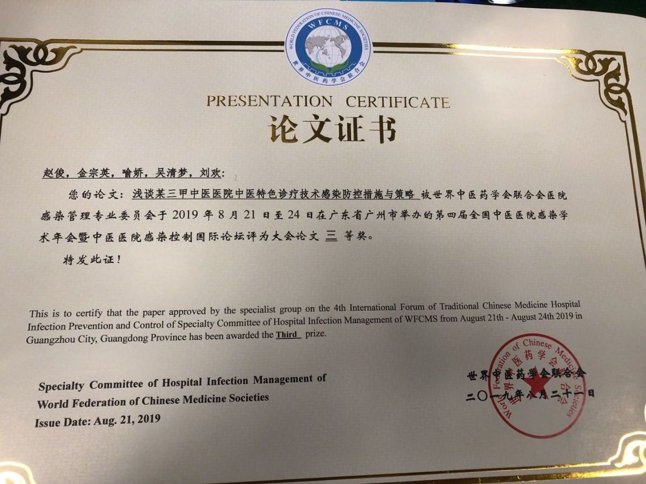 2019年8月21-24日,世界中医药学会医院感染管理专业委员会第二届学术年会暨中医医院感染控制国际论坛在广州举行。我院感染管理办公室赵俊等撰写的论文《浅谈某三甲中医医院特色诊疗技术感染防控措施与策略》荣获大会论文三等奖。