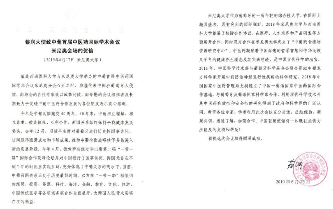 中国驻葡萄牙大使馆蔡润大使专程发来贺电,祝贺中葡首届中医药国际学术会议(米尼奥大学会场)的召开并预祝会议取得圆满成功。